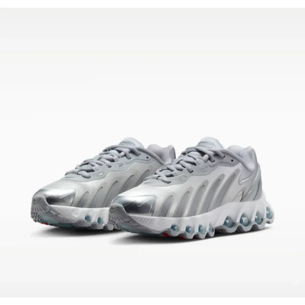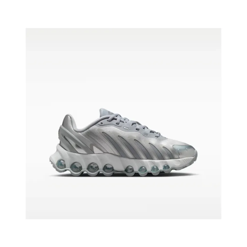 Nike Air Max Dn8 kombinerer Nikes Dynamic Air-stødabsorbering med en slank, lavprofil-silhuet for at levere fjedrende, responsiv komfort til hverdags løb og afslappet brug. Nøgleegenskaber: Ulvegrå | Off white | Metallisk sølv | Mesh | Dynamic Air-stødabsorbering med otte trykrør | Åndbar mesh-overdel | Fleksriller for bevægelse | Klassisk snørelukning | Hælklemme i plastik for ekstra fastholdelse | Reflekterende detaljer | Lavprofil, skulpturel silhuet | Sideslidser for ekstra ventilation | Forstærket tåkappe | Sammensætning og pleje: Mesh-overdel | Skummellemsål | Gummiydersål | Hælklemme i plastik