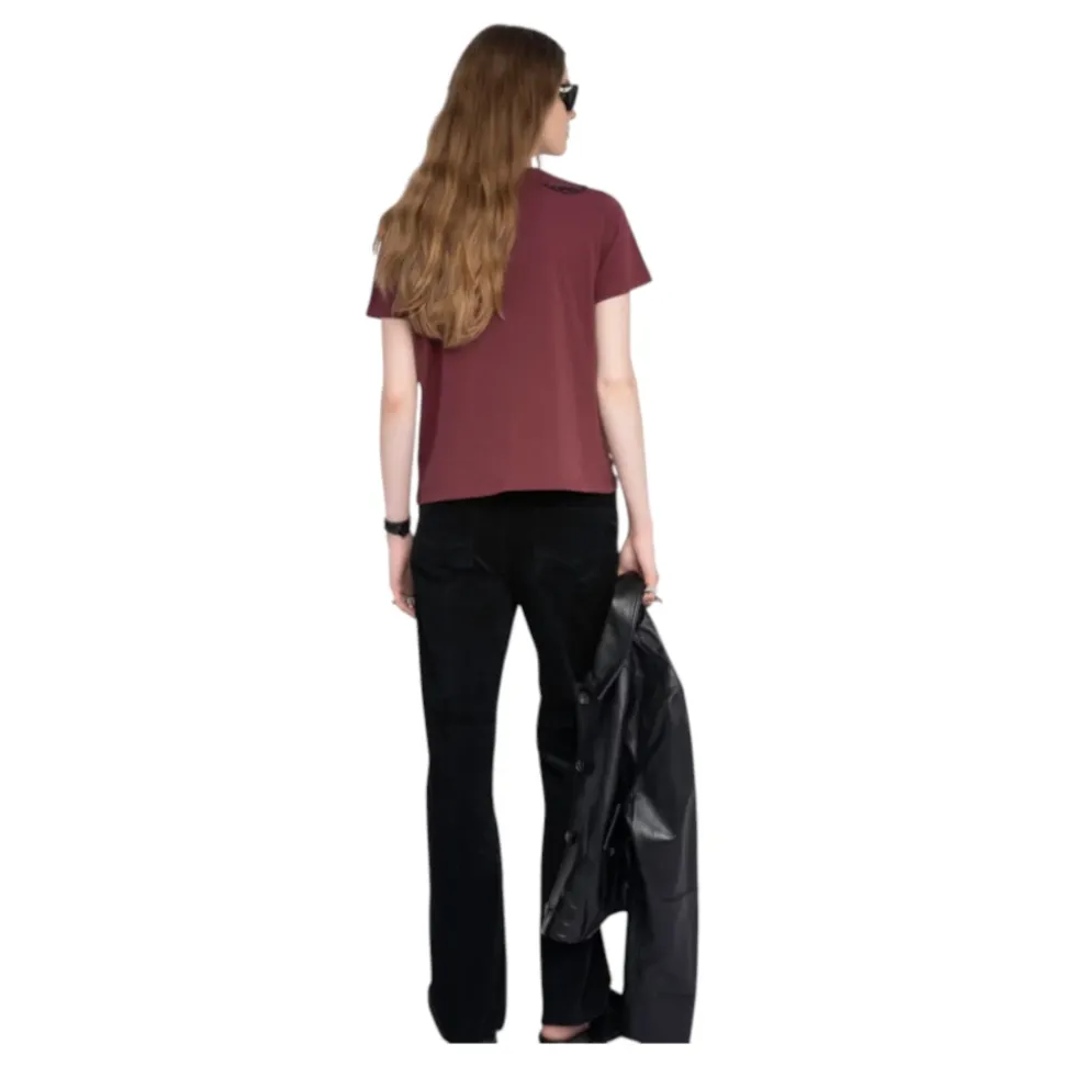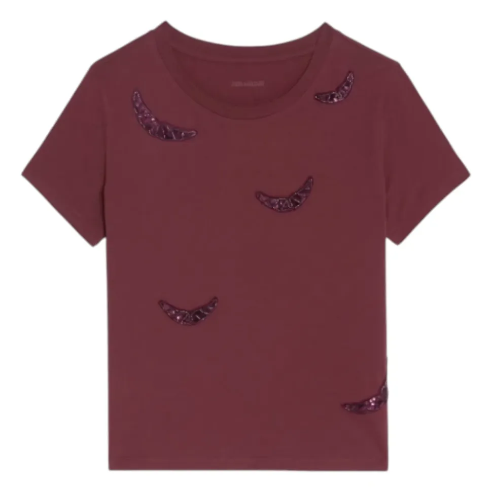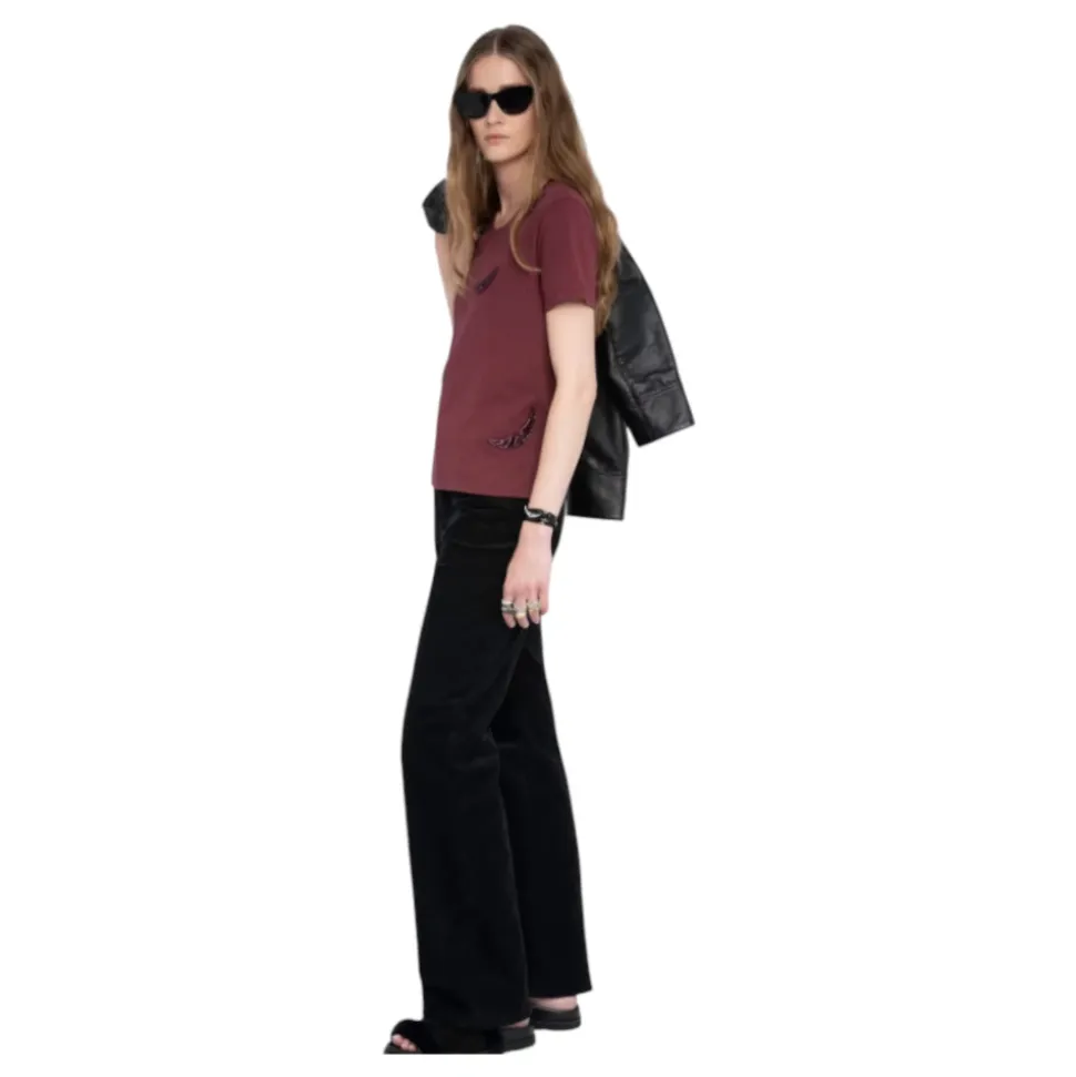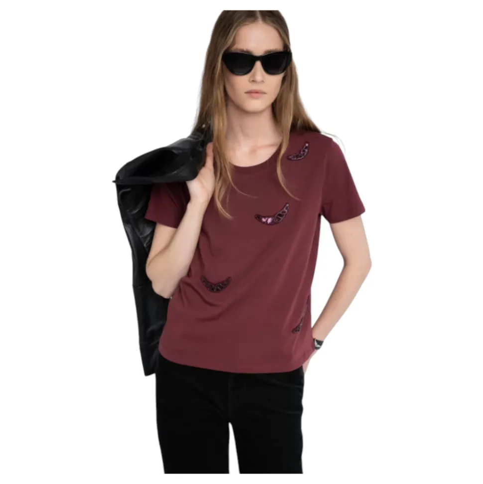 Zadig & Voltaires Alys T-shirt er en kortærmet tee med rund hals, der defineres af sine broderede signaturvinger – en hverdagsbasisvare med en diskret branddetalje. Vigtigste egenskaber: Rød | Bordeaux | Bomuld | Rund hals | Korte ærmer | Broderede signaturvinger | Lige silhuet | Dimensioner og pasform: Klassisk pasform; er lidt lille i størrelsen – overvej at vælge en størrelse større for en mere afslappet pasform. | Sammensætning og pleje: 100% bomuld