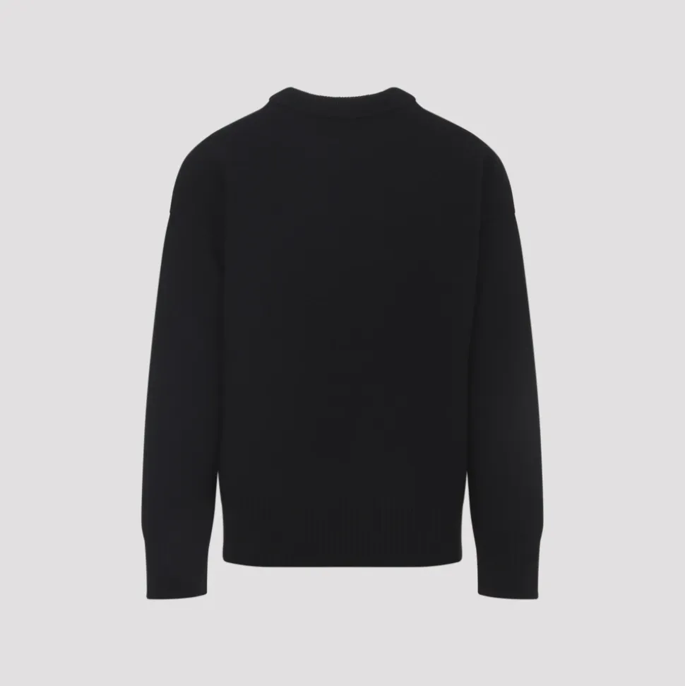 Sort Ami Paris ‘Ami De Coeur’ langærmet sweater i uld med karakteristisk rødt logo på brystet. Rund hals og lige kant. Indvendige sømme. Ribkant ved hals, kant og manchetter.