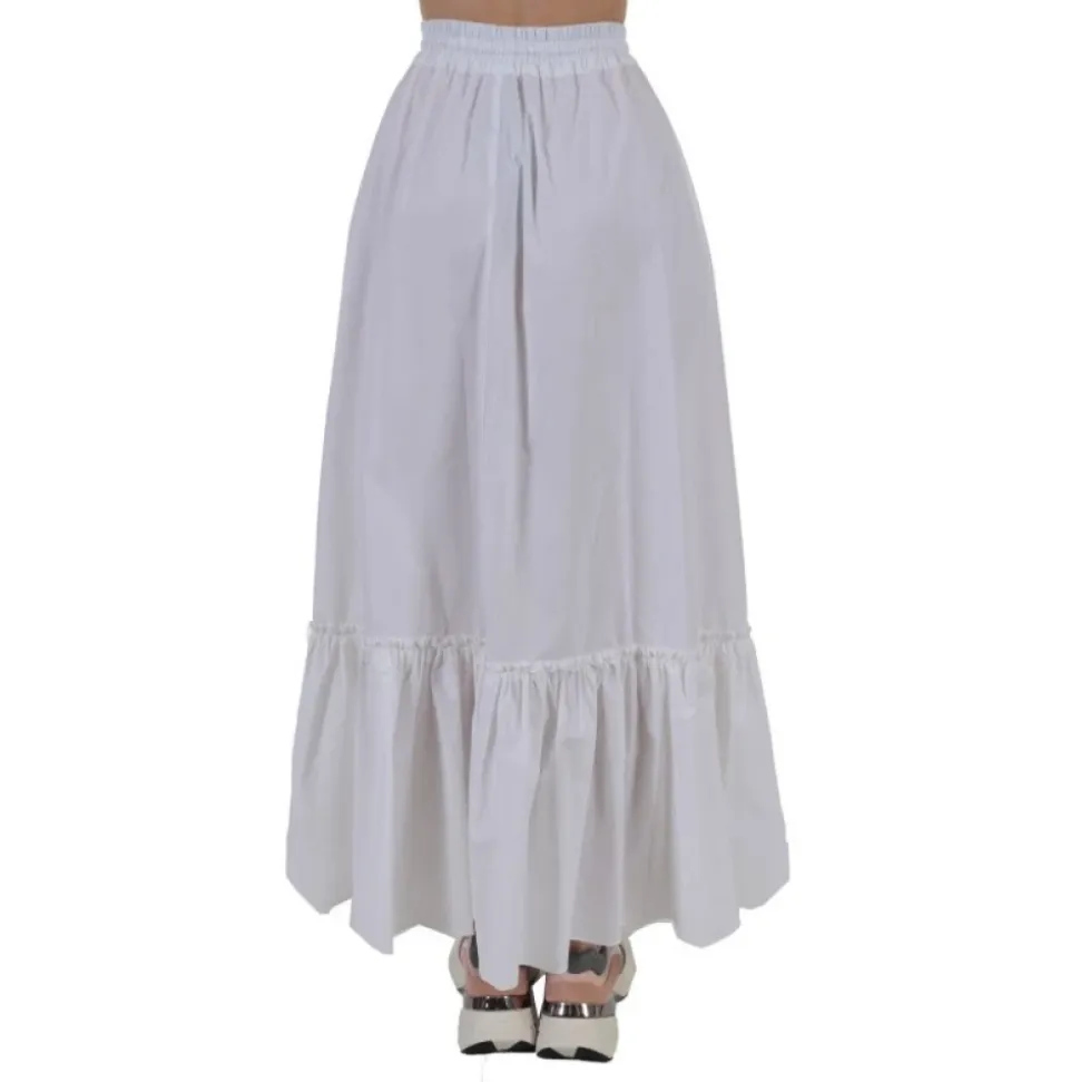 PINKO Appule Skirt er en lang maxinederdel med flæser, der fremhæver bevægelse og en defineret kant for et elegant hverdags- eller festlook. Vigtige egenskaber: Hvid | Flæsekant | Maxilængde