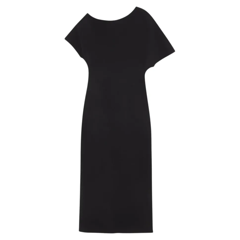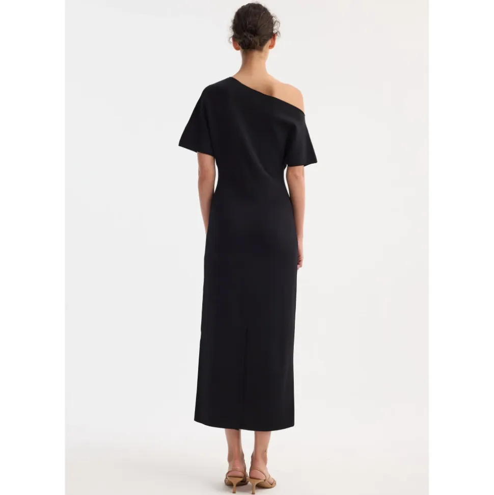 Róhe Asymmetrisk Strikkjole kombinerer en moderne off-shoulder silhuet med en skræddersyet talje og en udvidet midi-nederdel. Ideel til specielle lejligheder eller et løftet hverdagslook, den fremhæver et elegant, bevægeligt design. Nøgleattributter: Sort | Schwarz | Viskose | Strækstof | Slids bagpå for bevægelsesfrihed | Elastisk stof for en fleksibel pasform | Brede ærmer for ubegrænset bevægelse | Asymmetrisk off-shoulder udskæring | Figursyet talje og udvidet nederdel | Brede, korte ærmer | Centreret slids bagpå | Dimensioner & pasform: Skræddersyet pasform | Midi-længde | Modellen er 179 cm høj og bærer EU 36 | Sammensætning & pleje: 70% Viskose | 30% Nylon