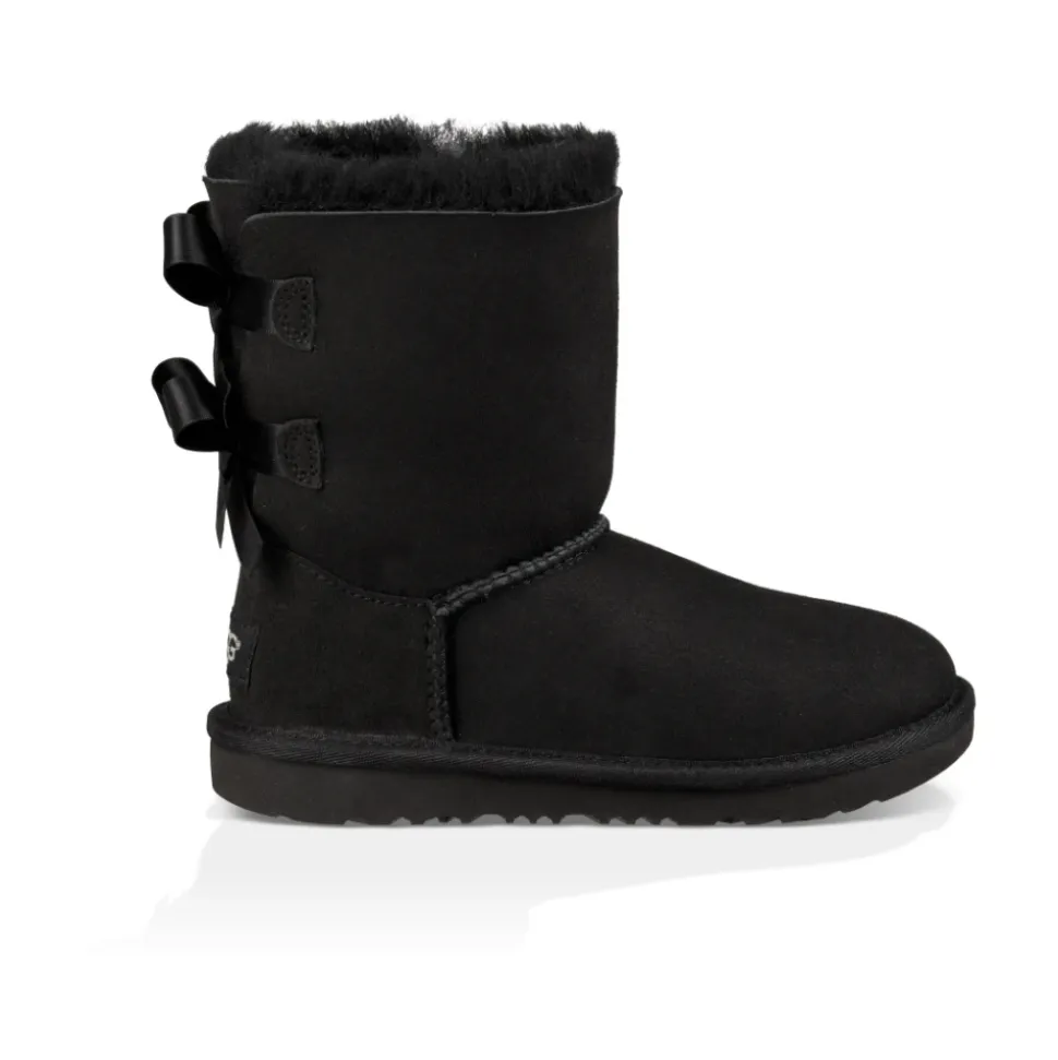 Præsenterer de sorte UGG Bailey Bow II støvler til børn, perfekte til din lille modeelsker. Disse støvler er lavet af førsteklasses ruskind og har en behagelig pelsindersål for ultimativ komfort. Den fleksible Treadlite-ydersål af gummi giver fremragende trækkraft, mens det vand- og pletbestandige overdel sikrer holdbarhed. Med en læderhælplade prydet med UGG-logoet udstråler disse støvler høj kvalitet. Den skumindlægssål og overlock-søm-detaljering tilføjer ekstra stil og støtte. Komplet med silkebånd på bagsiden er disse støvler et must-have for enhver stilbevidst lille pige. Skafthøjde: 15 cm.