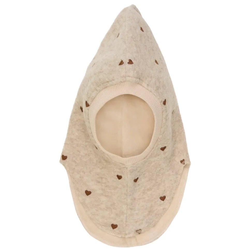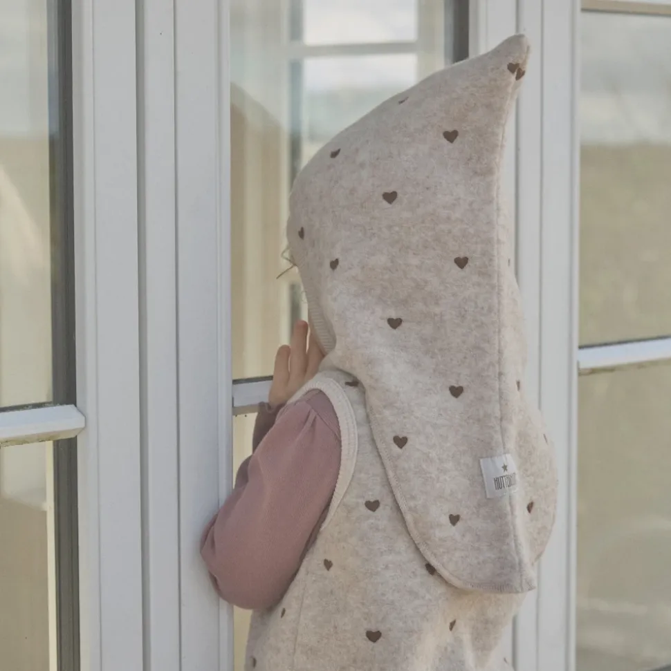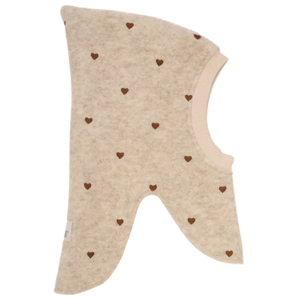 HUTTEliHUT Balaclava All Over Emb. Wool er en to-lags uldbalaclava med blødt velourfor og broderede hjerter over det hele, designet til at give varm, fuld dækning til hoved og hals. Vigtige egenskaber: Beige | Sand melange | Uld | Isolerende | To-lags konstruktion | Blødt velourfor | Elastisk ribkant ved ansigtsåbning for sikker pasform | Splitdesign med forlænget hals for ekstra dækning | Spids hovedform | Broderede hjerter over det hele | Bred elastisk ribkant | Dimensioner & pasform: Størrelse 48: 0-12 måneder | Størrelse 50: 12-24 måneder | Størrelse 52: 2-4 år | Størrelse 53: 4-6 år | Tætsiddende pasform med elastisk ribkant omkring ansigtsåbningen | Sammensætning & pleje: Yderstof: 80% uld, 20% polyester | For: 80% bomuld, 20% polyester | Maskinvask 30°C på skånsomt uldprogram; brug et mildt uldvaskemiddel og brug ikke skyllemiddel. Vend vrangen ud og brug lav centrifugering. Form mens den er våd og tør fladt; må ikke tørretumbles eller placeres på en radiator. Ved håndvask, brug lunkent vand, undgå vridning og tryk forsigtigt med et håndklæde for at fjerne overskydende vand.