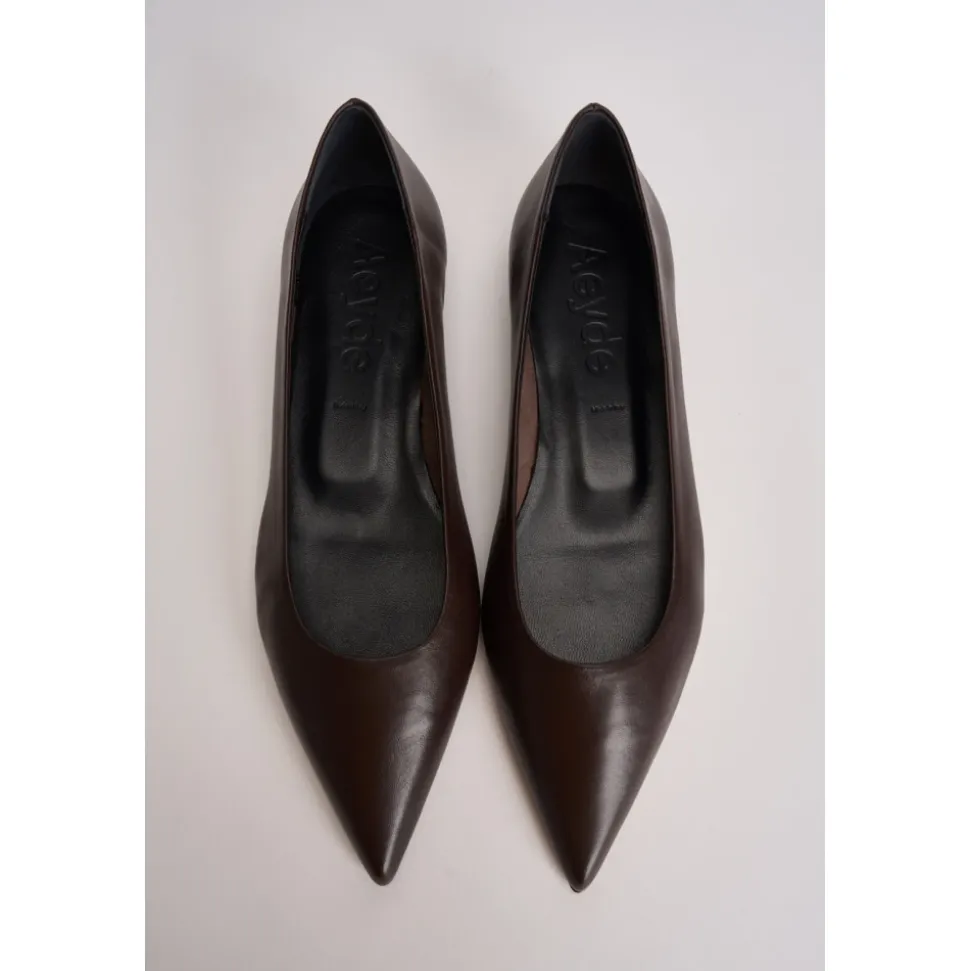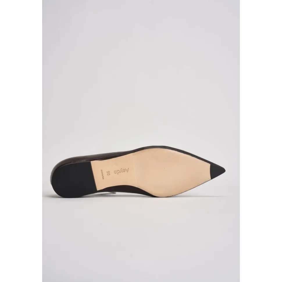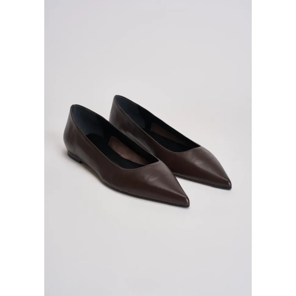 AEYDE Ballerina med spids tå er en lav sko i læder med en spids tå, designet som en simpel slip-on til et elegant hverdagslook. Vigtigste egenskaber: Brun | Læder | Ingen lukning | Spids tå | Lav silhuet | Dimensioner og pasform: Almindelig pasform | Sammensætning og pleje: Læder