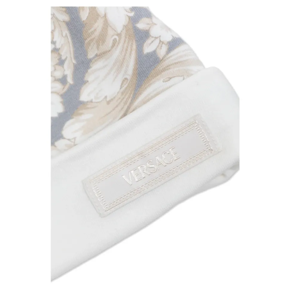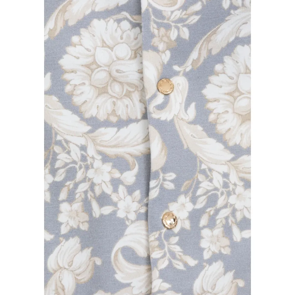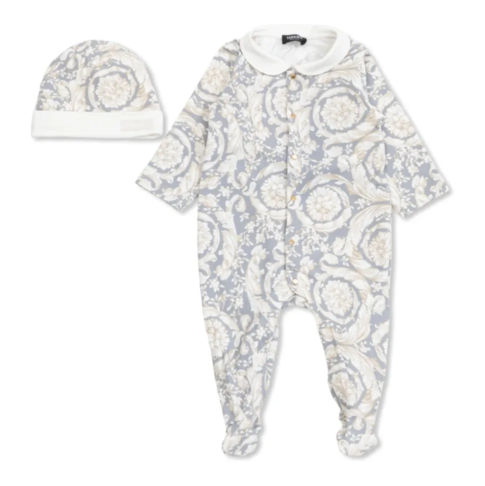 Versace Barocco Sleepsuit Set kombinerer en blød bomuldsjersey-sleepsuit med en matchende, tætsiddende hat, fremhævet af det karakteristiske Barocco botaniske print for et raffineret look. Designet til behagelig hverdagsbrug og nem påklædning. Vigtige egenskaber: Grå | Print | Bomuldsjersey | Blødt, hudvenligt stof | Åndbart | Stræk for bevægelsesfrihed | Trykknaplukning for nem påklædning | Lukkede fødder (fodbeklædning) | Matchende, tætsiddende hat | Nem påklædning og skift | Barocco Kids botaniske print | Peter Pan-krave | Lange ærmer | Design med fødder | Dimensioner og pasform: Klassisk snit | Sammensætning og pleje: 91% Bomuld | 9% Elastan | Følg plejeinstruktionerne på produktets etiket.