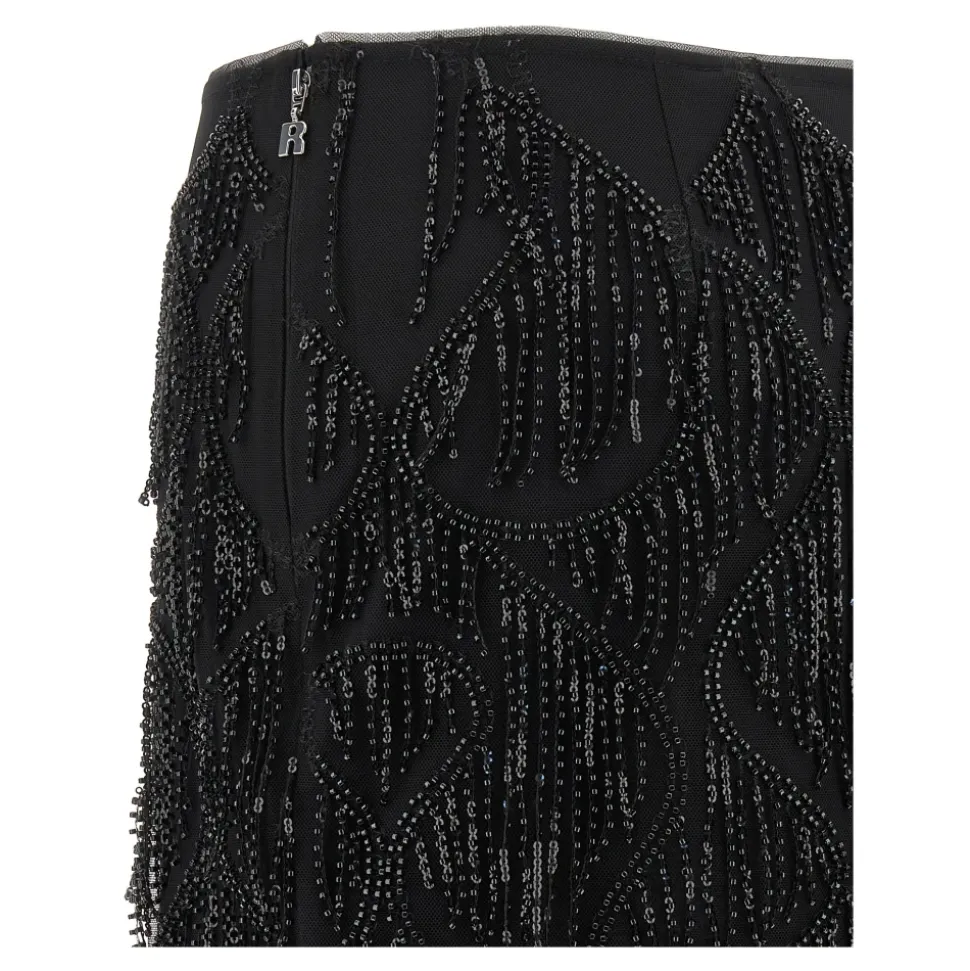 ROTATE Birger Christensen Beaded Fringed Skirt kombinerer pailletbroderet stof med perlebesatte frynser for en iøjnefaldende mini-nederdel, der er klar til fest. Den har en side lynlåslukning og et viskosefor for behagelig brug. Vigtige egenskaber: Sort | Viskose | Side lynlåslukning | Viskosefor | Pailletbroderi | Perlebesatte frynser | Mini længde | Dimensioner & pasform: Slim fit | Sammensætning & pleje: 97% viskose | 3% elastan