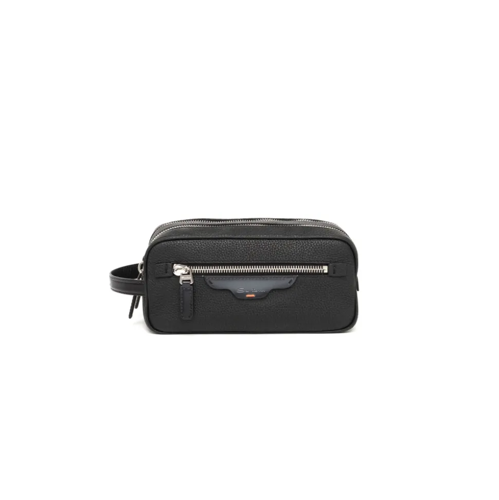 Santoni Beauty i hamret læder er en toilettaske i læder med en finish i hamret læder, designet til at holde dine essentielle toiletartikler organiseret på rejsen. Nøgleattributter: Sort | Læder | Hamret lædertekstur | Sammensætning & pleje: Læder | Aftørres med en blød, tør klud. Undgå langvarig udsættelse for vand og direkte varme. Påfør læderbalsam efter behov.