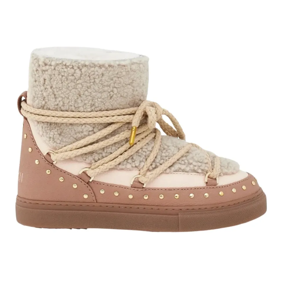 Hold dig varm og stilfuld i disse Inuikii naturlæder vinterstøvler til kvinder. Med en hyggelig pelskant indvendigt og udvendigt, justerbare beige snørebånd, læder hælkappe og dekorative guld nitter. Gummisålen og den runde tå giver komfort og holdbarhed. Ankellængde med en hæl på 2,5 cm.