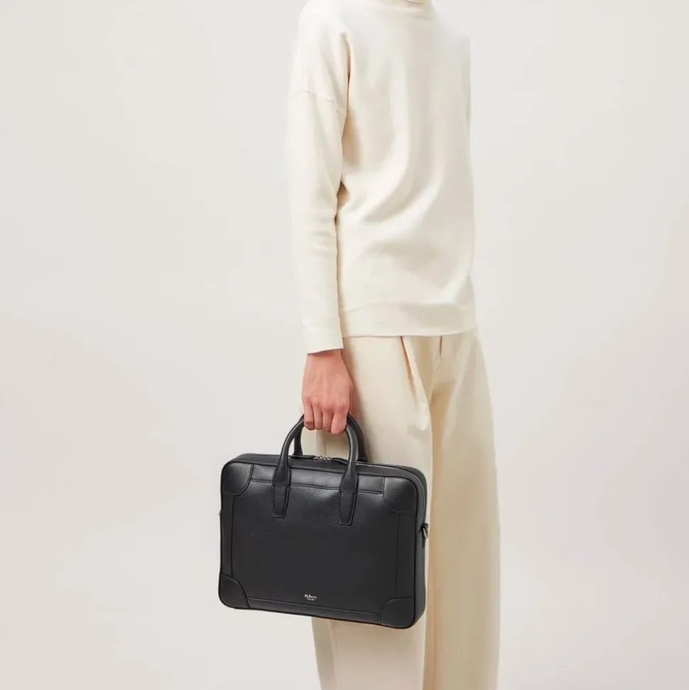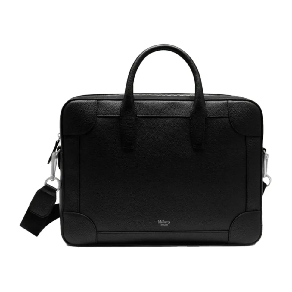 Mulberry Belgrave Dokumentmappe er en tidløs dokumentholder i læder, designet til at bære dokumenter og daglige fornødenheder i hånden eller over skulderen. Vigtige egenskaber: Sort | Læder | Justerbar skulderrem i webbing | Top håndtag til at bære i hånden | Lynlås lukket hovedrum | Indvendig lynlåslomme | To indvendige slip lommer | Canvas foer | Traditionel, tidløs silhuet | Foliepræget Mulberry signatur på forsiden | Sølvfarvet hardware | Lille klassisk narv tekstur | Dimensioner & pasform: Højde: 28 cm | Længde: 38 cm | Dybde: 7 cm | Hanke fald: 11 cm | Bæremuligheder: hånd eller over skulder | Justerbar skulderrem | Sammensætning & pleje: 100% Læder