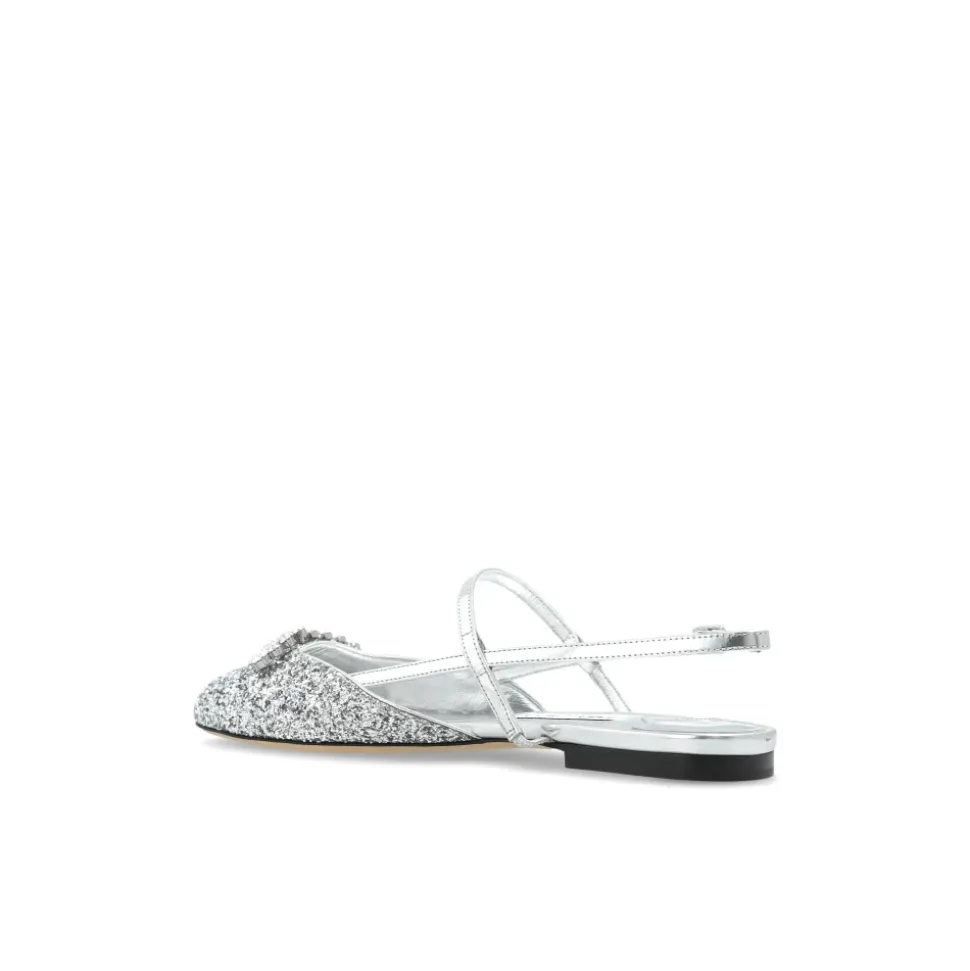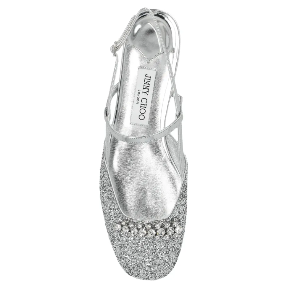 “BELINDA” BALLET FLATS af JIMMY CHOO udstråler en udsøgt stil, hvor tidløse klassikere møder sofistikeret modernitet. Den slanke silhuet, der har en let firkantet tå, er afsluttet med krydsede remme på vristen og en åben hæl, der omsvøber foden som smykker for at levere både ynde og komfort. DET SØLVBELAGTE OVERMATERIALE, der er intrikat dækket af glitter, fortryller med sin glans, mens det skinnende, naturlige læder pryder interiøret og remmene på denne model og tilføjer enestående luksus. Øjet fanges straks af den spektakulære dekoration af fremtrædende krystaller, der pryder tåen. Prestige understreges af logoet fra det anerkendte modehus, der er synligt på indersålen og fungerer som en garanti for fremragende kvalitet og den unikke tradition for italiensk håndværk. HVORFOR VÆLGE DETTE PRODUKT? * Håndlavet med mesterlig præcision * Luksuriøse, naturlige materialer * Iøjnefaldende glans og unikke krystaludsmykninger * Et design fra et mærke kendt for at klæde berømtheder på * Enestående komfort og lethed Sålens højde på det højeste punkt: 1,5 cm