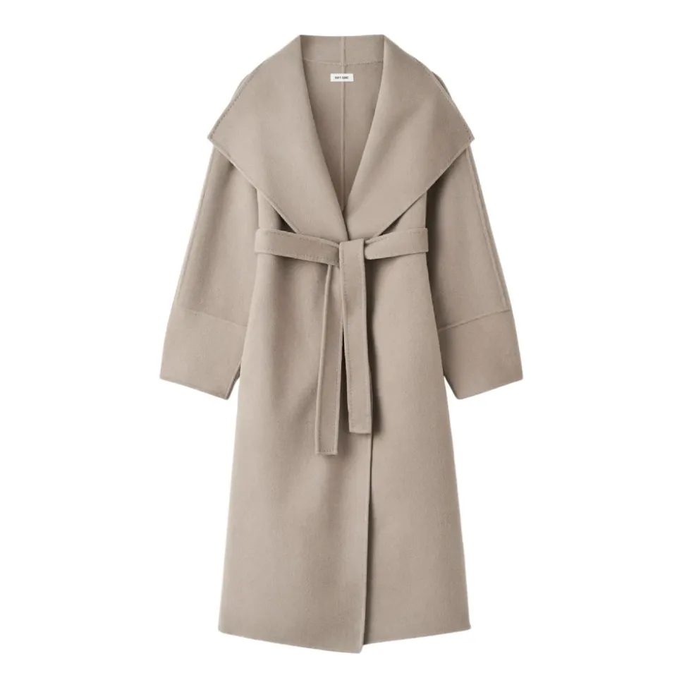 Soft Goat Belted Coat kombinerer en lang, omsluttende silhuet med en bred shawl-krave og et bindebånd i taljen for raffineret, let lag-på-lag. Nøgleegenskaber: Beige | Nude | Uld | Sidelommer | Bindebælte | Bred shawl-krave | Sænket skulderlinje | Lang silhuet | Sammensætning og pleje: 90% uld | 10% cashmere