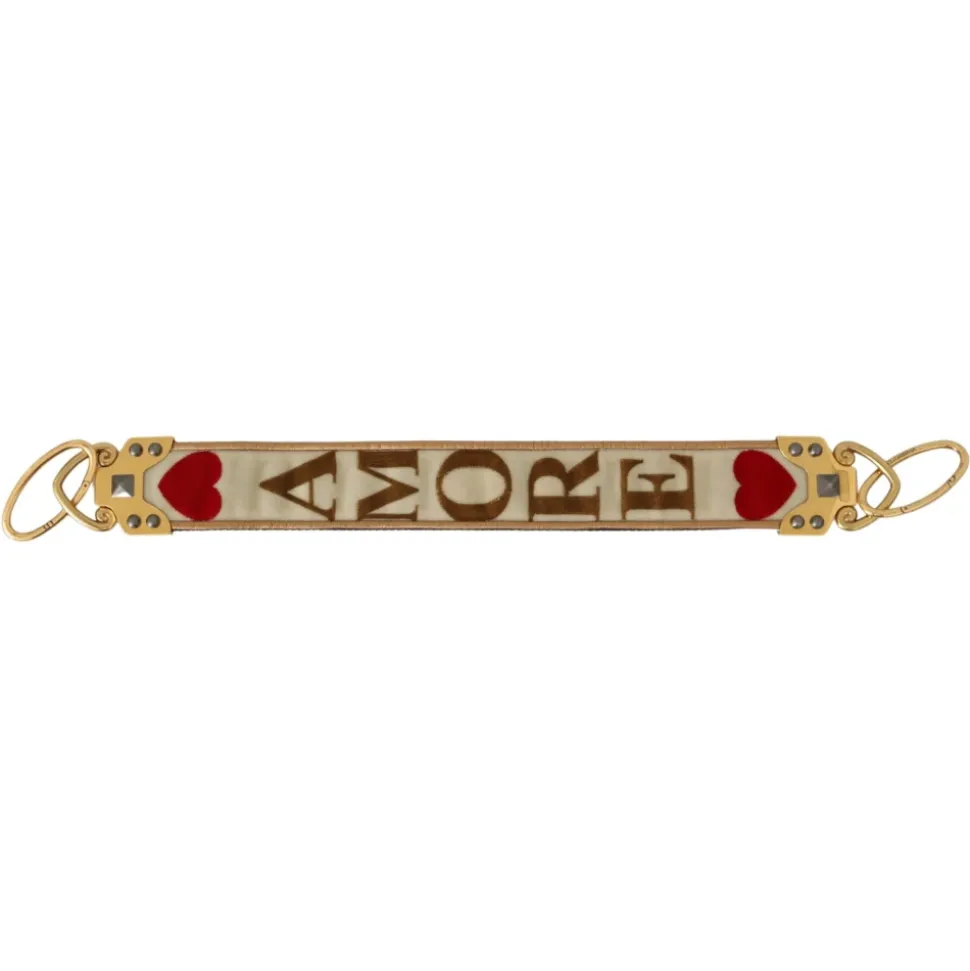 Pift din håndtaske op med en luksuriøs touch med denne Dolce & Gabbana skulderrem. Med et guld hvidt AMORE print, udstråler dette italiensk-fremstillede tilbehør elegance og charme. Fremstillet af en blanding af læder og tekstil, tilføjer denne alsidige rem ubesværet stil til ethvert outfit. Mål: 55cm x 5cm.