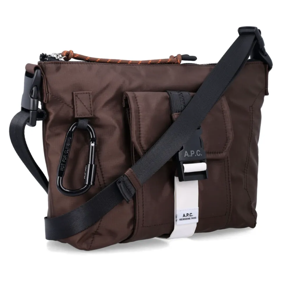 A.P.C. Besace Trek er en kompakt, udendørs-inspireret skuldertaske designet til organiseret hverdagsbrug. Den kombinerer slidstærk nylonkonstruktion med flere lommer og en aftagelig rem for alsidig urban brug. Nøgleattributter: Brun | Marrone | Nylon | Slidstærkt stof | Toplynlåslukning | Justerbar og aftagelig skulderrem | Frontklaplomme med plastikspænde og logoprint | Sidelomme med lynlås | Baglomme med trykknapslukning | Aftagelig sort karabinhage | Indvendig lynlåslomme | Flad indvendig lomme | Frontklap med logospænde | Lynlåsstrop i klatrereb | Navneskilt på bagsiden | Kompakt rektangulær silhuet | Dimensioner & pasform: Højde: 29 cm | Bredde: 18,5 cm | Dybde: 2,5 cm | Sammensætning & pleje: 100% nylon | Aftørres med en blød, tør klud.