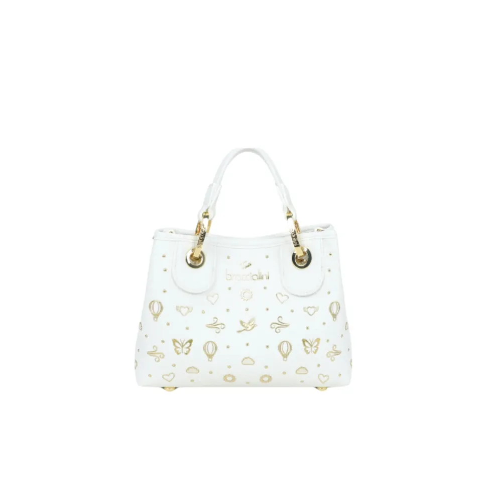 Braccialini Beth Strass Lille Håndtaske kombinerer en funklende overflade med nitter og praktiske muligheder for at bære den på to måder. Den er ideel til brug fra dag til aften og kombinerer en aftagelig clutch med en logorem, for fleksibel brug. Vigtige egenskaber: Hvid | Bianco | Polisynt | Dobbelte håndtag | Aftagelig og justerbar logobæltet skulderrem | Aftagelig indvendig pose, der fungerer som en ekstra taske | Clip lukning | Guldfarvede nitter med motiver (hjerter, sommerfugle, varmluftballoner, skyer) | Funklende rhinestone- og nittedetaljer | Kompakt silhuet | Mål og pasform: 18 cm x 15 cm x 7 cm | Kompakt størrelse | Kan bæres på to måder: i hånden eller over skulderen | Sammensætning og pleje: Polisynt