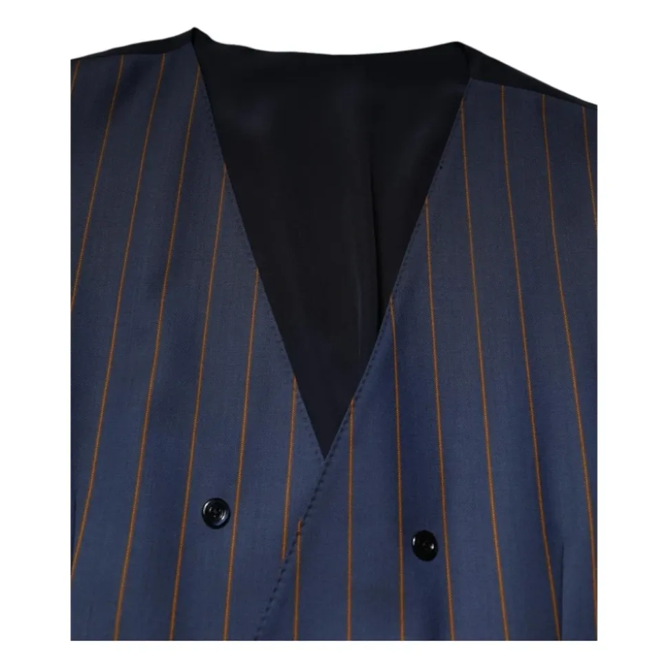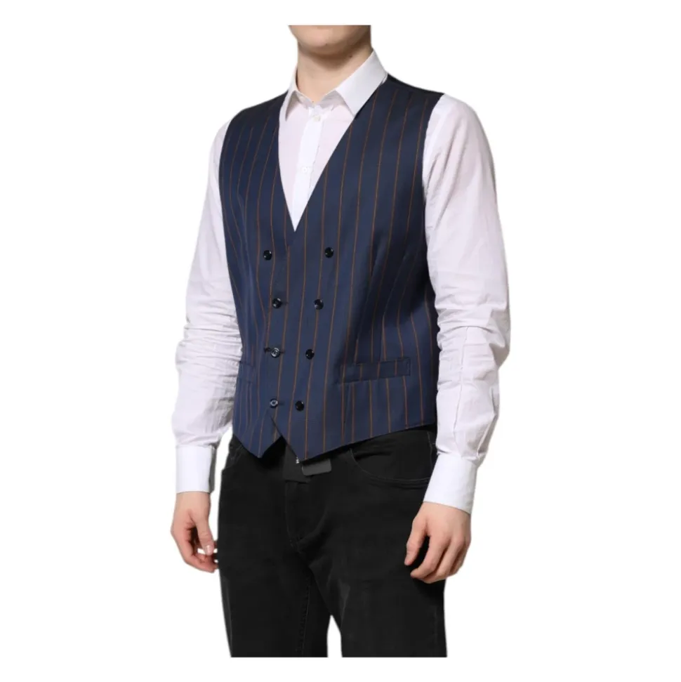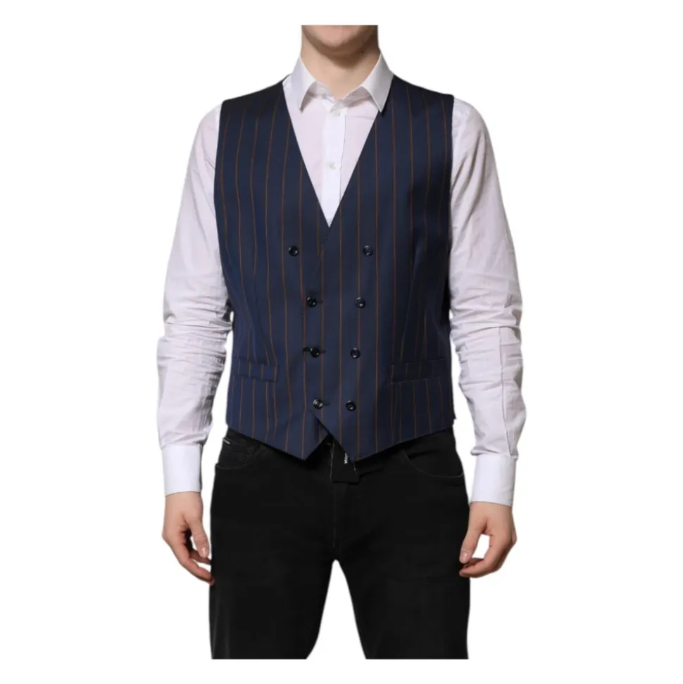 Løft din formelle påklædning med Dolce & Gabbana Blue Stripes Wool Formal Men Waistcoat Vest. Denne enkeltknap vest er lavet af 100% ren uld, hvilket sikrer en luksuriøs følelse og et sofistikeret look. Den justerbare rygstrop sikrer en skræddersyet pasform, mens den fulde frontknaplukning tilføjer et klassisk touch. Vesten har et elegant blåt striber mønster og er fuldt foret med 100% silke for ekstra komfort. Afsluttet med subtile logo detaljer, er denne vest et bevis på italiensk håndværk.