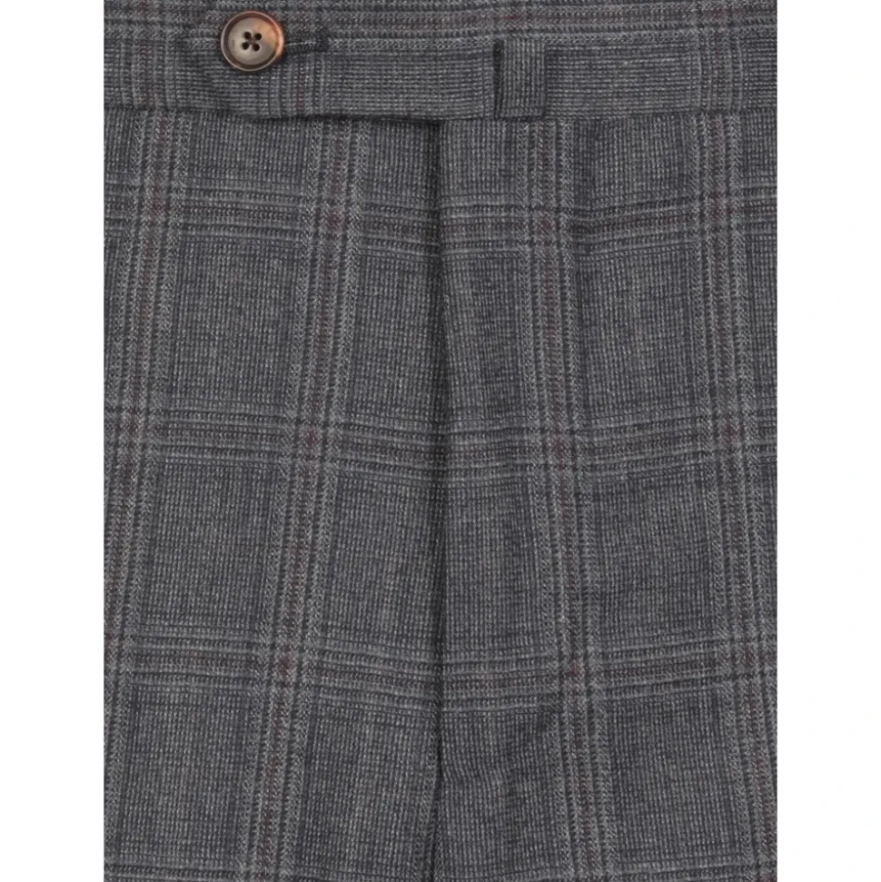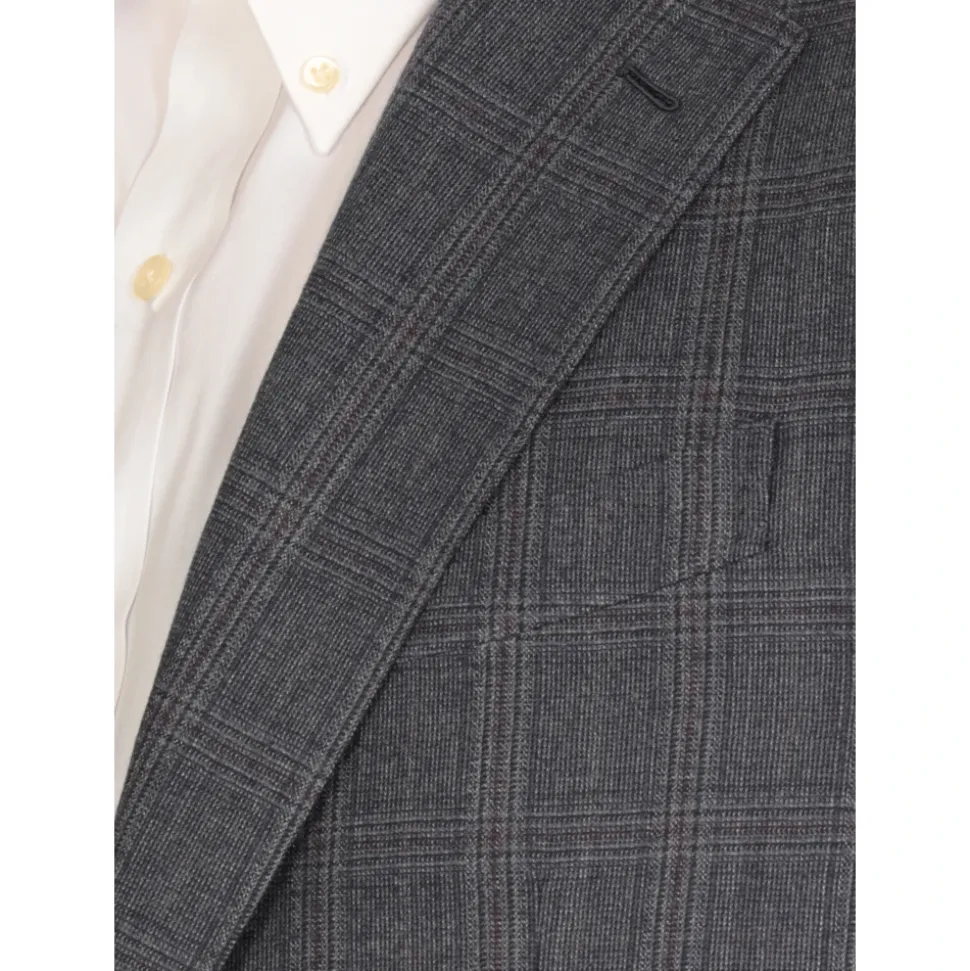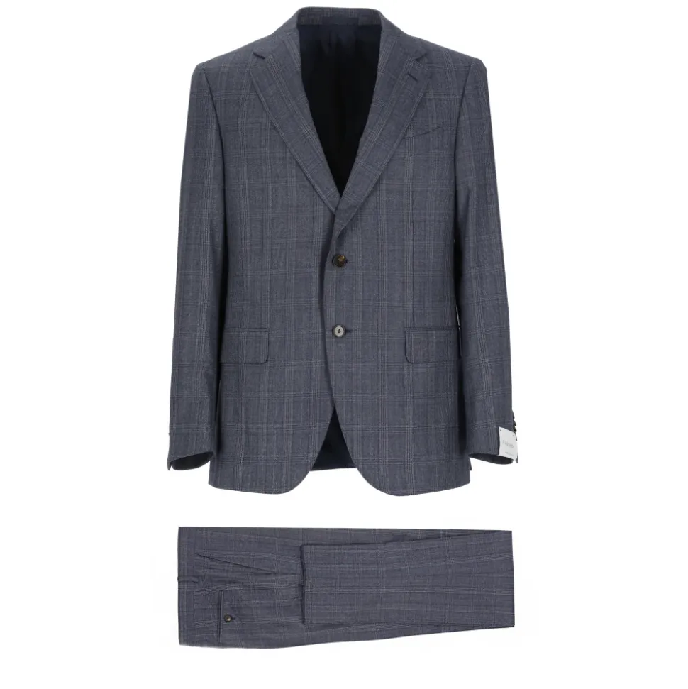 Fremhæv din stil med dette mørkeblå Caruso uldsæt til mænd. Jakken har en brystlomme, klassisk reverskrave og lange ærmer med knapper. Sættet inkluderer frontknapslukning, to forlommer med klap og to bageste slidser i kanten. Bukserne har frontknapper og lynlåslukning, to sidelommer med slidser og to bageste knaplommer.