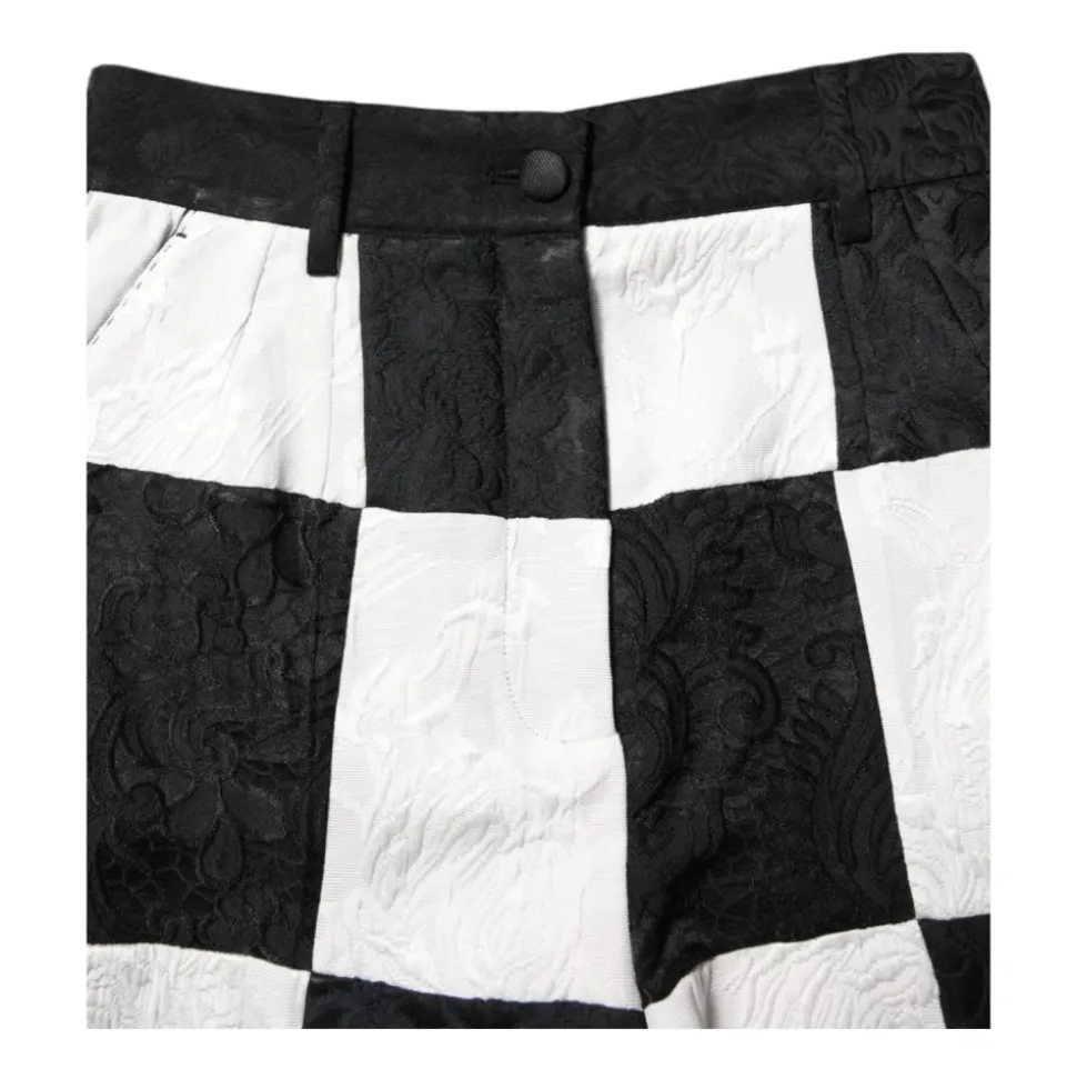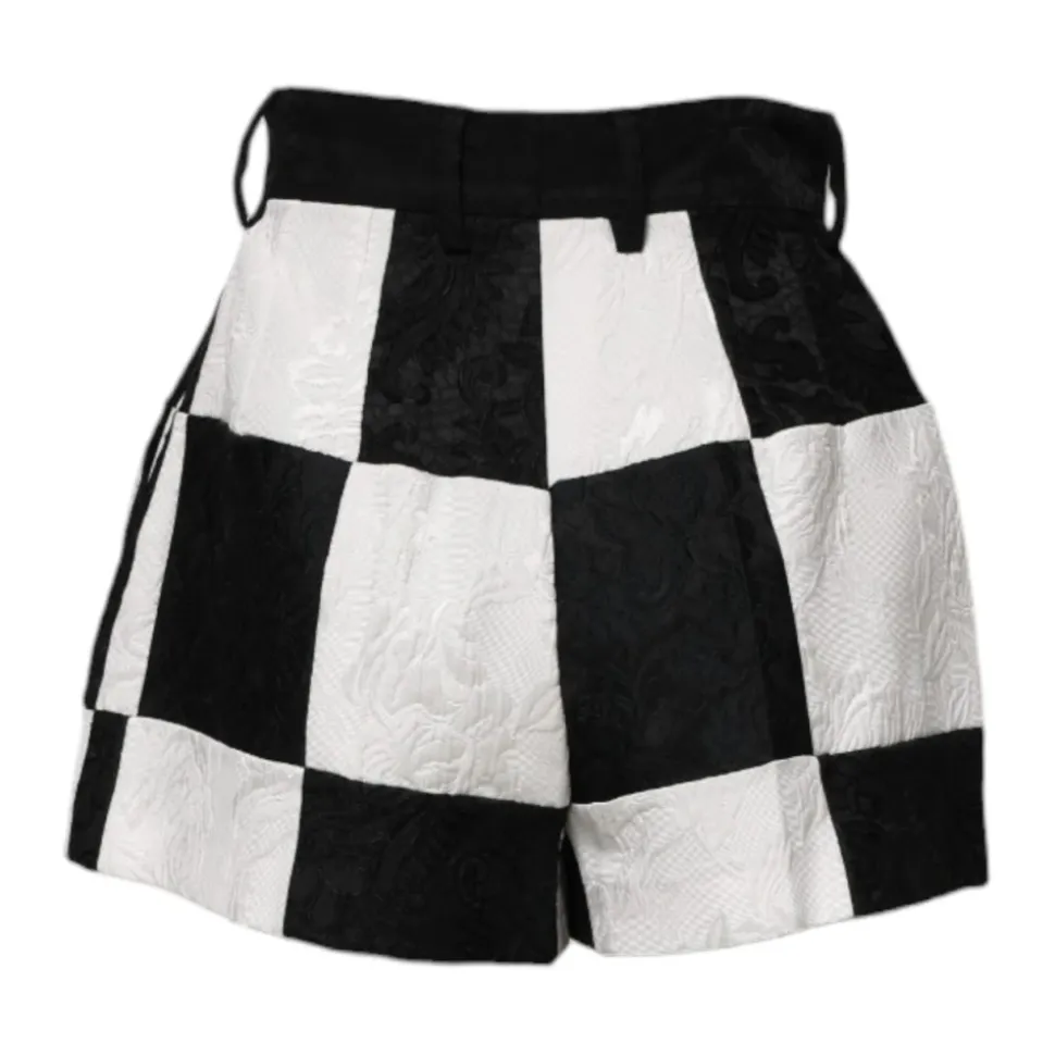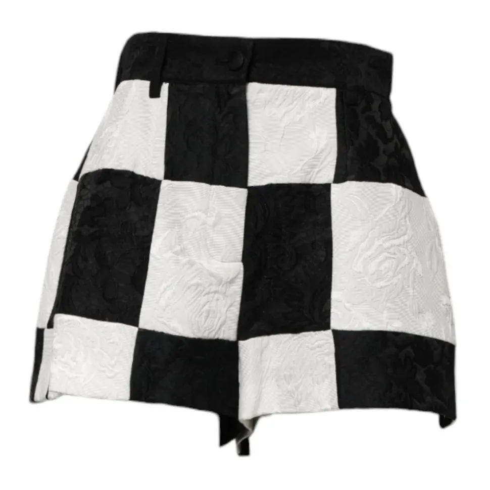 Forkæl dig selv med disse smukke Dolce & Gabbana højtaljede træningsshorts. Fremstillet i Italien med et blomstret brokademønster, har disse autentiske shorts en blanding af polyester, bomuld, acetat, silke, akryl, uld og viskose. Den slående sort-hvide farvekombination og lynlåslukning tilføjer en luksuriøs touch til din træning.