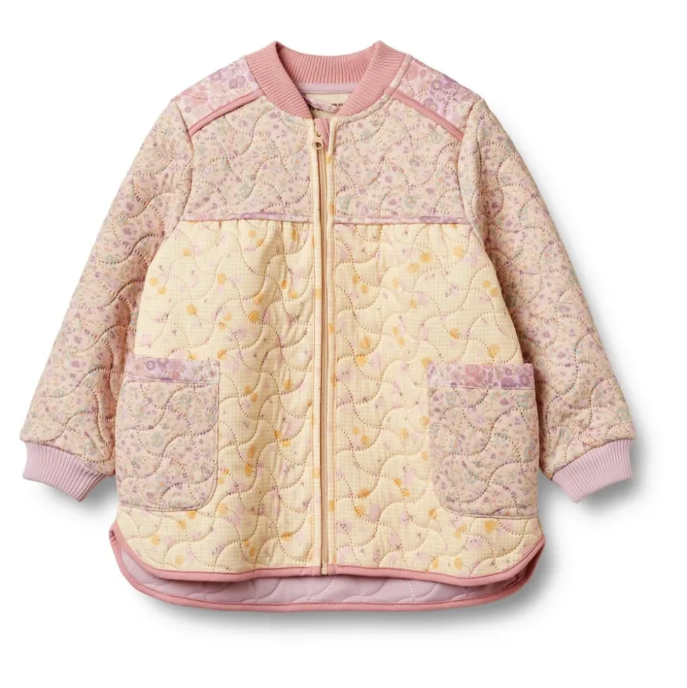 Wheat – Thermo Jacket Liv – Pansies Super lækker termojakke fra Wheat. Denne i et skønt mix af farver og blomsterprint, som gul, hvid, beige, rosa og lilla nuancer.Wheats populære termotøj er en sand hverdagsfavorit, da det bløde og lette materiale gør det behageligt at bevæge sig rundt i.Termojakken har ekstra længde og gennemgående lynlås med hagebeskytter foran.Den har krave og manchetter i blød rib. Termojakken er med to åbne sidelommer foran samt reflekslogo bagpå.Denne termojakke er produceret i 100% polyester. Jakken kan bruges både indendørs, såvel som praktisk overgangstøj, når vejret endnu er lunt udenfor. Termojakken er ikke vandtæt, men er vandafvisende.Den er fantastisk til overgangen fra forår til sommer og igen fra sommer til efterår, hvor dit barn har brug for overtøj, der ikke er for varmt. På de kølige dage kan termojakken kombineres med en regnjakke eller teknisk overtøj for bedre isolering. Bonusinfo:Printet på denne termojakke er håndtegnet af Wheats eget in-house designteam. Materiale: 100% polyesterTeddyfor: 100% polyesterStandard 100 af OEKO-TEX®Rart at vide:Normal pasform med ekstra længde til over knæeneRibkrave og manchetterLommer med kileBuede slidser i sidesømmeneYKK lynlås med hagebeskyttelseReflekserPatchwork af forskellige signatur prints og farveVandafvisende (ikke vandtæt)PFC-friFluorfri vand- og smudsafvisende finish (BIONIC FINISH ECO) Vask: 30 grader skånevaskTåler ikke tørretumbler Husk at følge vaske- og brugsanvisningStyle no.: 7260-978R GRS_9515