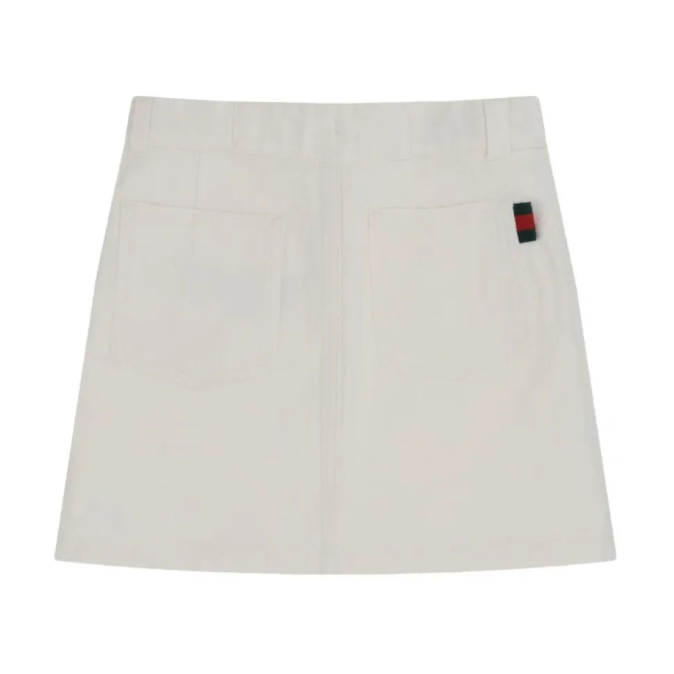 Forkæl din lille pige med denne stilfulde Gucci nederdel i hvid. Med skjult lynlås, knaplukning, bæltestropper, to diagonale lommer og to baglommer.