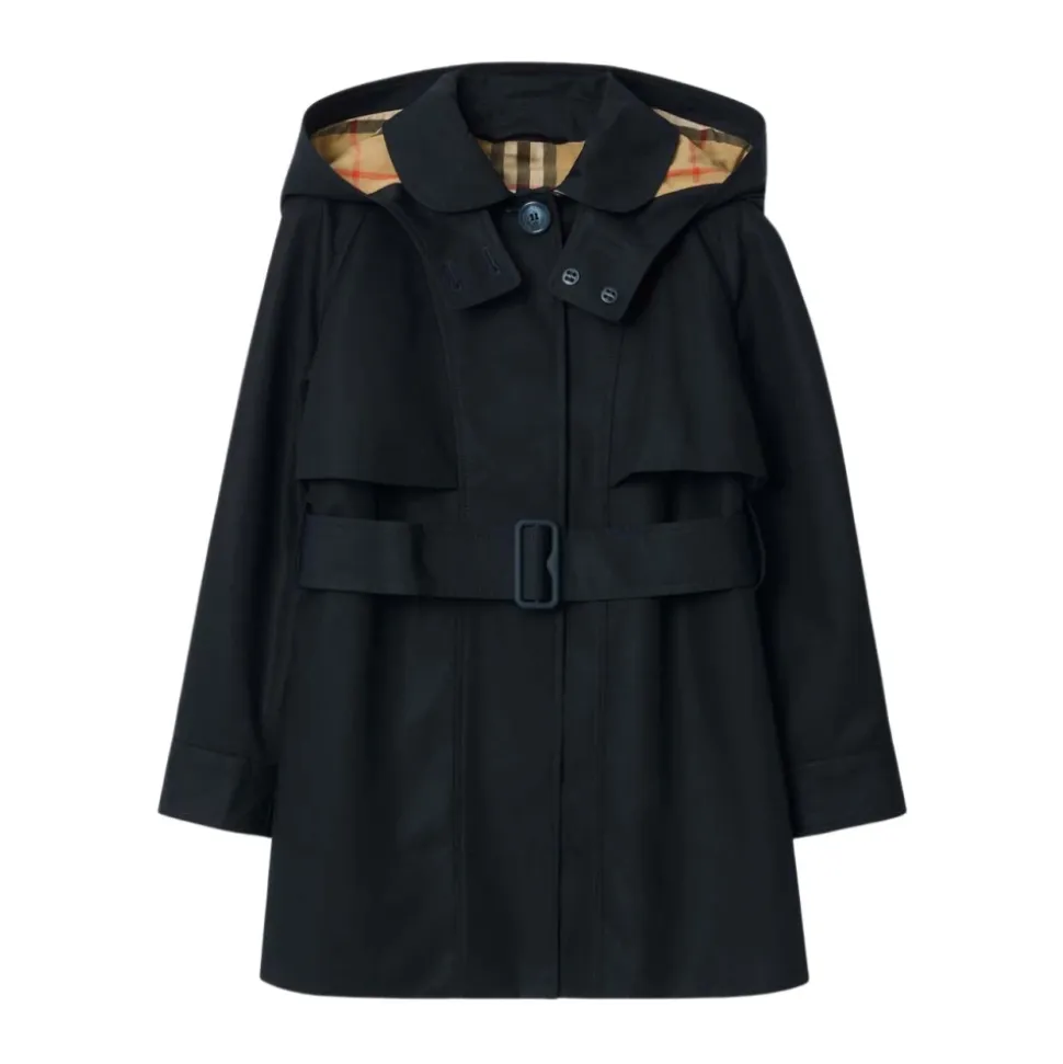 Burberry Bomuldsforet Trenchcoat med Hætte kombinerer klassiske trenchcoat-detaljer med en aftagelig hætte og labelens signaturternede for. Den er designet som et let, vejrklart yderlag til hverdagsbrug. Vigtige egenskaber: Stormblå | Bomuld | Aftagelig hætte | Skjult knaplukning | Sidelommer | Justerbart spænde bælte | Enkeltknappet lukning | Plisserede manchetter | Burberry tern på underkrave og for | Sammensætning & pleje: Yderlag: 100% bomuld | Underkrave: 100% bomuld | For: 100% bomuld | Ærmefor: 100% polyester | Specialrens