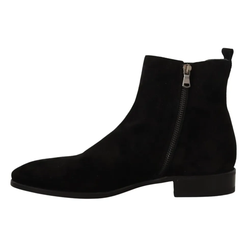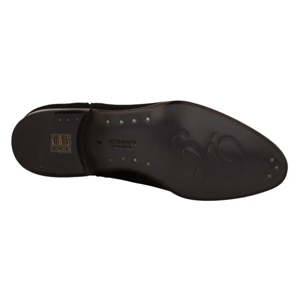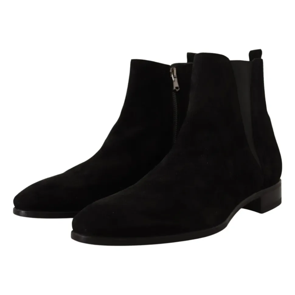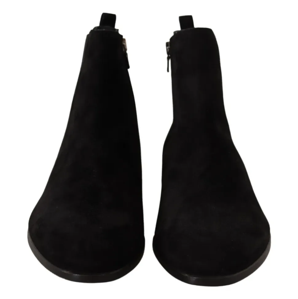 Opgrader din stil med disse Dolce Gabbana Sorte Ruskind Læder Chelsea Herre Støvler. Fremstillet med 100% autentisk ruskindslæder, har disse støvler en lynlåslukning i siden for nem ind- og udgang. Strækbåndene på siderne tilføjer en praktisk detalje, mens logo-detaljerne viser mærkets signaturstil. Fremstillet i Italien med enestående håndværk er disse støvler inkarnationen af eksklusivitet. Hæv din formelle stil med disse sorte Chelsea-støvler.