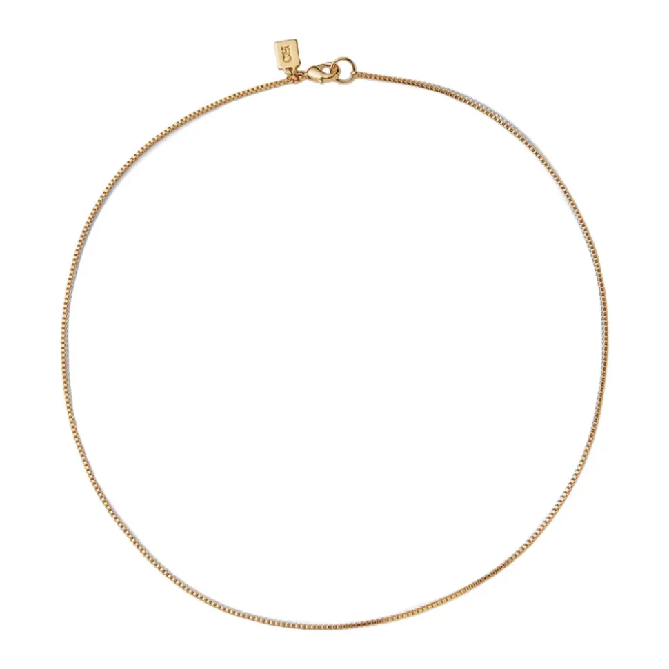 Crystal Haze Box Chain er en delikat guldbelagt box-link kæde designet til lag-på-lag og til at tilføje et vedhæng for at personliggøre dit look. Nøgleattributter: Gul | Guld | Guldbelagt messing | Kun kæde (intet vedhæng inkluderet) | Skyder vedhæng på kæden | Designet til lag-på-lag med andre halskæder | Box-link kæde | Delikat finish | Lagdelt stil | Minimalt, alsidigt design | Dimensioner & pasform: Længde – 50 cm | Sammensætning & pleje: 18k guldbelagt messing | Holdes væk fra vand, lotion og parfume.