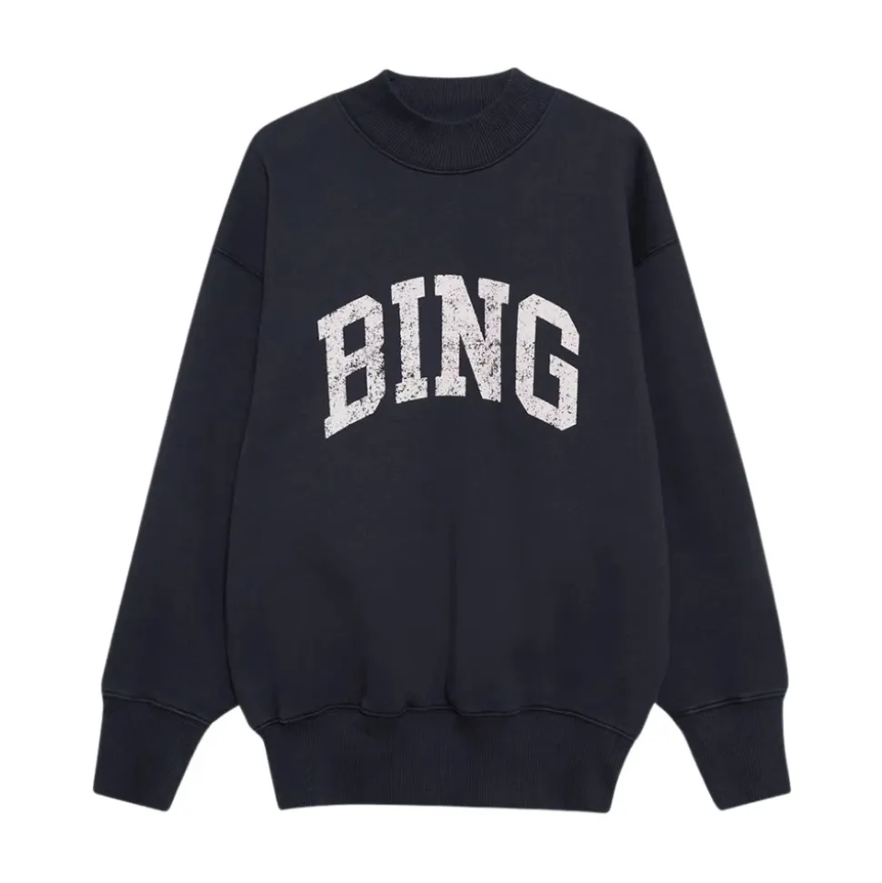 Anine Bing Bradie Sweatshirt tilbyder en perfekt blanding af afslappet komfort og elegant design, med en markant Bing grafik, der skiller sig ud mod den marineblå baggrund. Produkt detaljer: Navy | Blå | Bomuldsfleece | Høj mock neck | Lange ballonærmer | Ribkant | Dimensioner og pasform: Afslappet pasform | Gå en størrelse ned for en mere tætsiddende pasform | Sammensætning og pleje: 85% Bomuld | 15% Polyester | Maskinvaskbar
