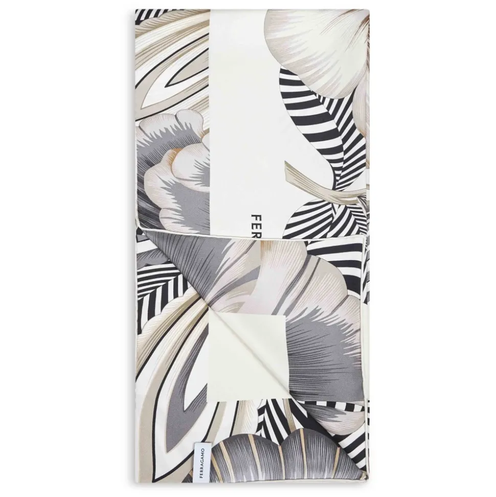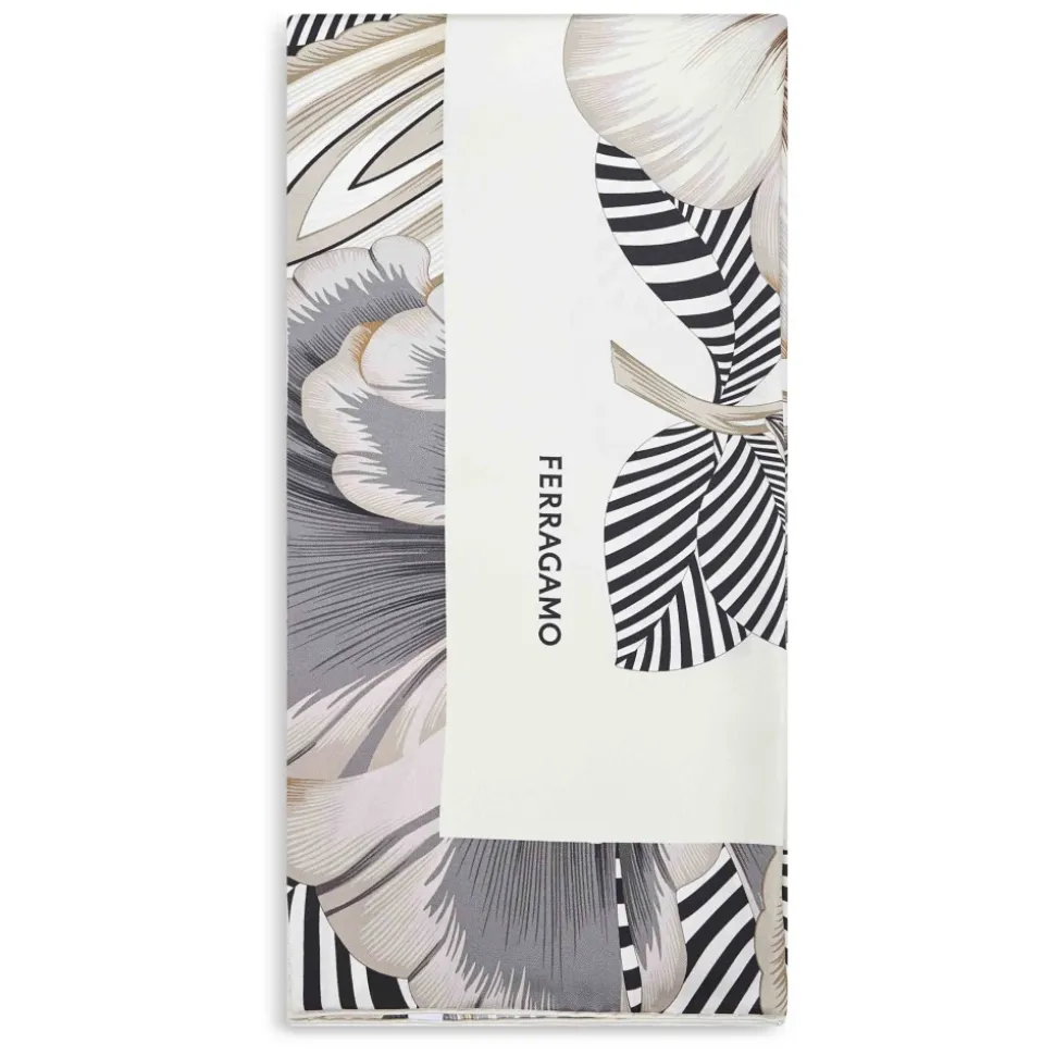 Ferragamo Brezza Print Silk Twill Scarf bringer et dristigt blomstermotiv og en kontrasterende jacquard-signatur til et klassisk firkantet silketørklæde. Ideel til at binde om halsen eller style som et statement-tilbehør. Vigtige egenskaber: Elfenben | Sort | Silke | Kontrasterende jacquard-signatur i bunden | Print med tre overdimensionerede blomster med stiliserede blade og botaniske strøg | Ensfarvet rammedetalje | Firkantet model | Mål og pasform: 90 x 90 cm | Sammensætning og pleje: 100% silke