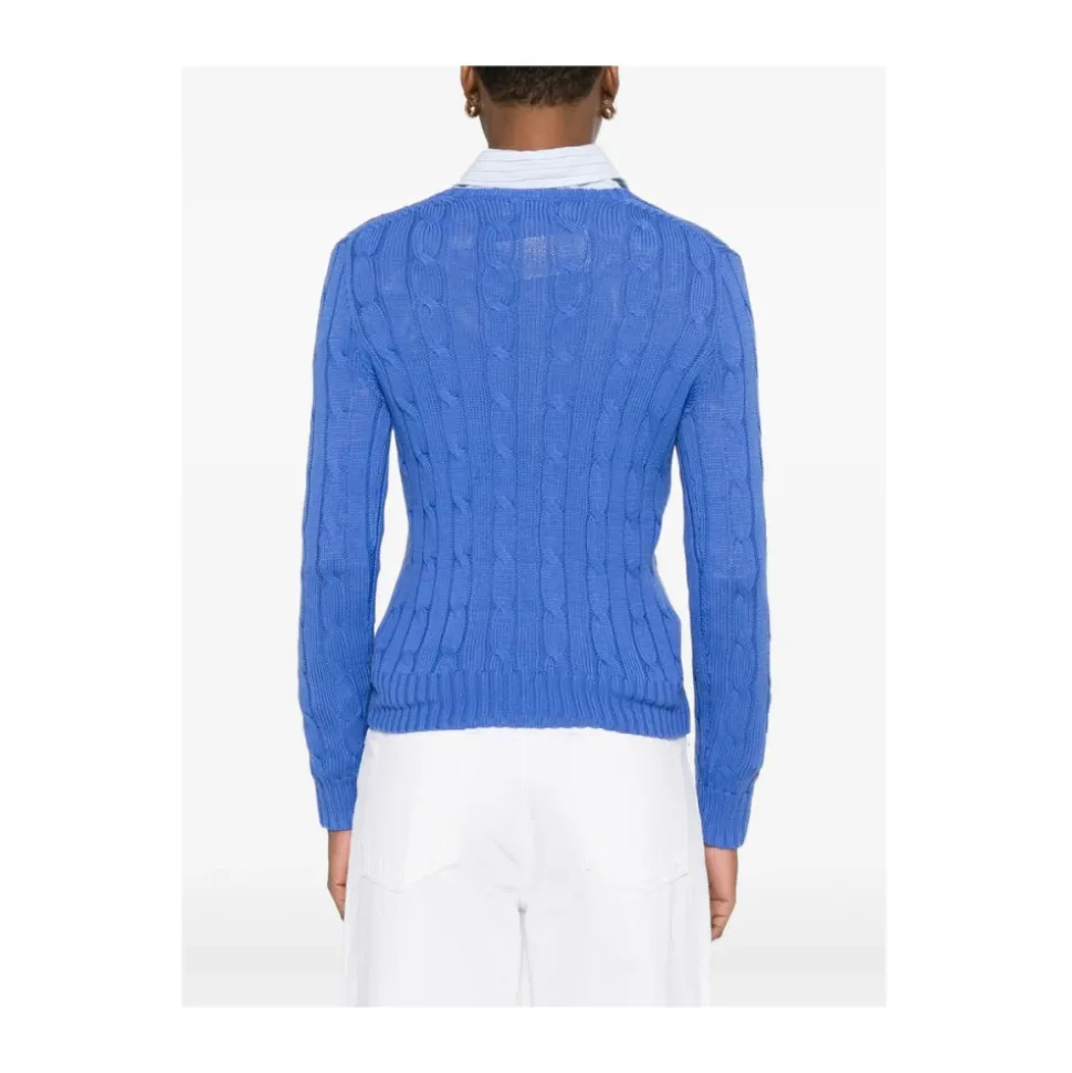 Ralph Lauren cable-strikket V-hals sweater kombinerer en klassisk kabelstrikket tekstur med en V-hals, der gør den nem at bruge i lag og til hverdagsbrug. Den ribstrikkede kant og manchetter giver en struktureret finish, der sikrer alsidig styling. Nøgleattributter: Blå | Strikket | Kabelstrikket | V-hals | Lange ærmer | Ribstrikket kant | Ribstrikkede manchetter