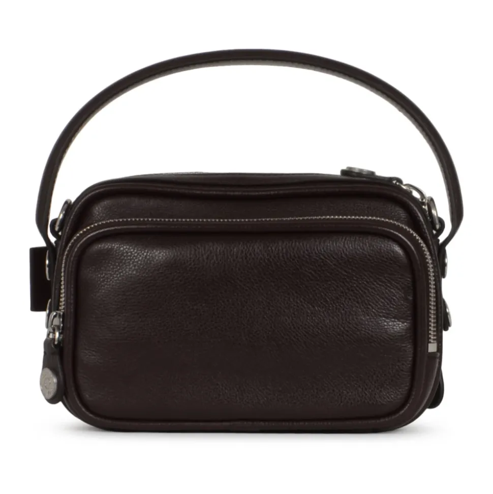 Acne Studios Camero Kit Crossbody Taske er en kompakt lædertaske med flere lommer, designet til alsidig hverdagsbrug. Den kombinerer flere lynlåsrum med et tophåndtag og en justerbar crossbody-rem til håndfri eller håndholdt brug. Nøgleattributter: Brun | Chokoladebrun | Kalvelæder | Justerbar, aftagelig crossbody-rem | Tophåndtag | Flere udvendige lynlåsrum | Tovejs-toplynlåslukning | Småkornet, skinnende læder | Multipocket-design | Knapdetaljer i denimstil | Sølvfarvet metalhardware | 1996 Acne Studios logo præget med sølvfilm | Brandet nøglevedhæng | Blød rektangulær, let sammenfaldet silhuet | Dimensioner & pasform: Højde: 12 cm | Bredde: 20 cm | Dybde: 11 cm | Crossbody-rem: Justerbar 46 cm–65 cm | Én størrelse | Alsidig bæring: tophåndtag eller crossbody | Sammensætning & pleje: 100% kalvelæder