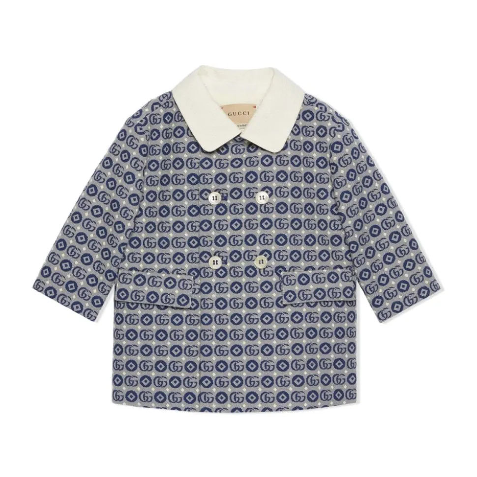 Gucci Cappotto er en bomuldsjacquardfrakke fra et særligt samarbejde med vintage børnetøjs samler Angela Lynne. Den skiller sig ud med sit geometriske monogrammotiv over det hele og en kontrasterende linnedkrave. Vigtige egenskaber: Blå | Bomuldsjacquard | Dobbeltradet | Forlommer | Lukning med knapper foran | Geometrisk monogrammotiv over det hele | Kontrasterende linnedkrave | Syninger på kraven | Dedikeret samarbejdslabels | Broderidetaljer | Sammensætning & pleje: 53% bomuld, 47% polyester (stof) | Krave: 100% hør | For: 100% bomuld | Broderi: 100% polyester