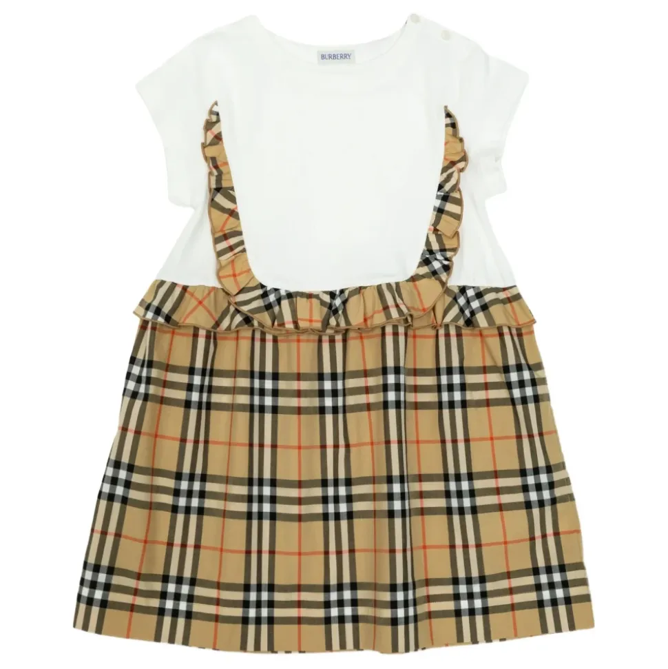 Burberry Check Trim Stretch Cotton Dress kombinerer en stretch bomulds overdel med et kontrasterende Burberry Check skørt og flæsekanter for et poleret hverdagslook. Vigtige egenskaber: Beige | Bomuld | Stretch stof | Knaplukning ved skulderen | Korte ærmer | Kontrasterende skørt med Burberry Check | Flæsekanter | Sammensætning & pleje: 96% bomuld, 4% elastan | Skørt: 100% bomuld | Maskinvask. Holdes væk fra ild.