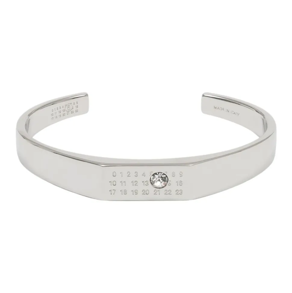 MM6 Maison Margiela Chevalier Bracelet genskaber chevalier-ringen som en aflang, åben manchet, der tilbyder et skulpturelt statement med en krystalaccent og et indgraveret numerisk logo. Nøgleattributter: Grå | Sølv | Messing | Åben manchetkonstruktion | Manchetarmbånd med krystaldetalje | Chevalier-inspireret udskåret overflade | Præget numerisk logo | Indgraveret brandlogo | Åben indfatningsdetalje | Rhinestone-accent | Dimensioner & pasform: One size | Sammensætning & pleje: 100% messing | Kontrast: 100% glas | Undgå salt, klorvand og aggressive væsker.