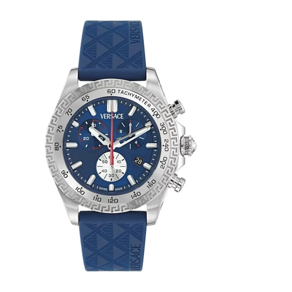 Versace Chrono X er et præcisions chronograph ur fra Versace, der kombinerer en urkasse i rustfrit stål med en markant blå urskive for et raffineret hverdags- og formelt look. Vigtigste egenskaber: Sølv | Blå | Rustfrit stål (IP sølv) | Chronograph funktion | Blå urskive | Sølvfarvet urkasse finish | Chronograph layout | Dimensioner & pasform: Urkasse diameter: 44 mm | Sammensætning & pleje: Rustfrit stål (IP sølv) | PU rem