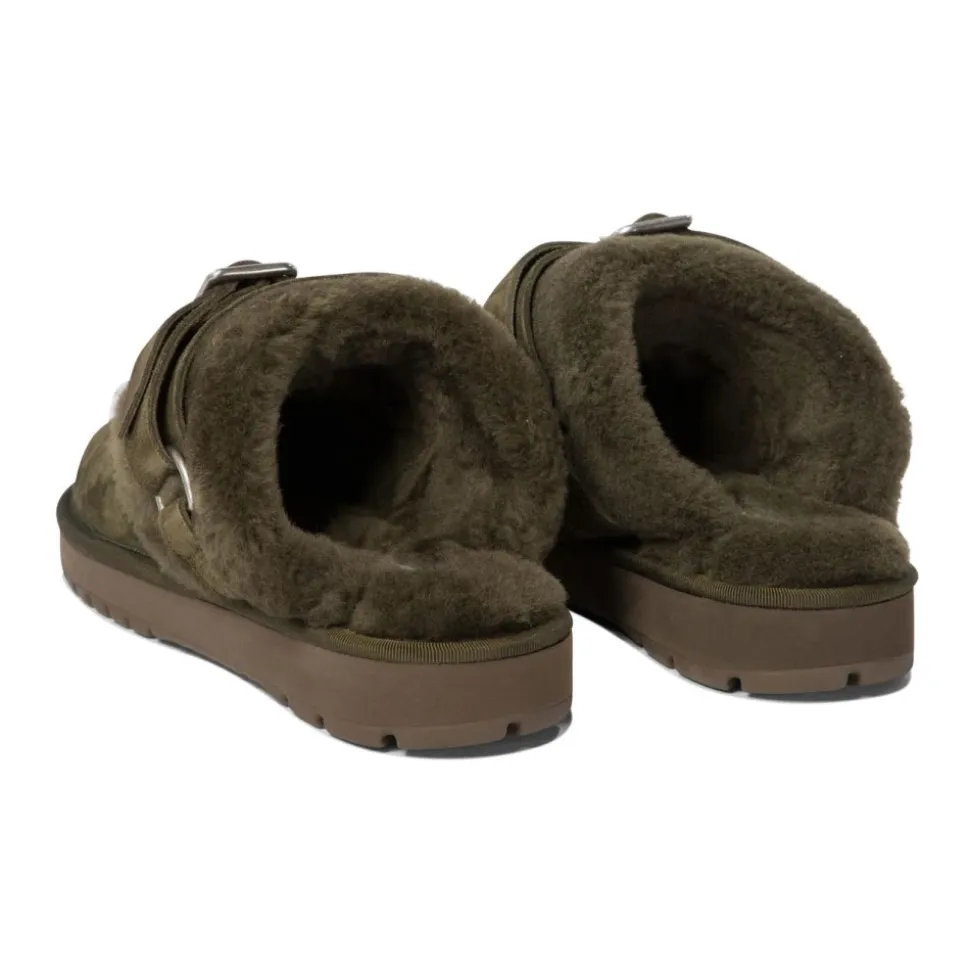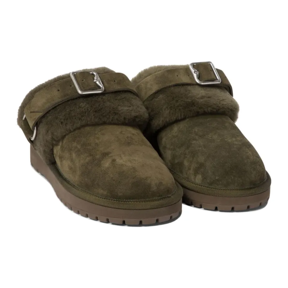 Burberry Chubby Mule i ruskind, foret med blødt shearling for ekstra varme og komfort. En justerbar rem med en metallisk ring og spænde passer sammen med en chunky platformssål for en moderne, elegant mule-stil. Vigtige egenskaber: Grøn | Ruskind | Isolerende shearling-foring | Justerbar rem for en sikker pasform | Blød shearling-foring for ekstra varme | Slip-on mule silhuet | Rund tå | Platformssål med teksturerede detaljer | Shearling-krave og -foring | Justerbar rem med metallisk ring og spænde | Sammensætning & pleje: Overdel: 50% kalveruskind, 40% fåreskind, 6% bomuld, 4% viskose | Foring: 100% fåreskind | Trim: 80% zinklegering, 20% kobber | Sål: 100% termoplastisk polyuretan