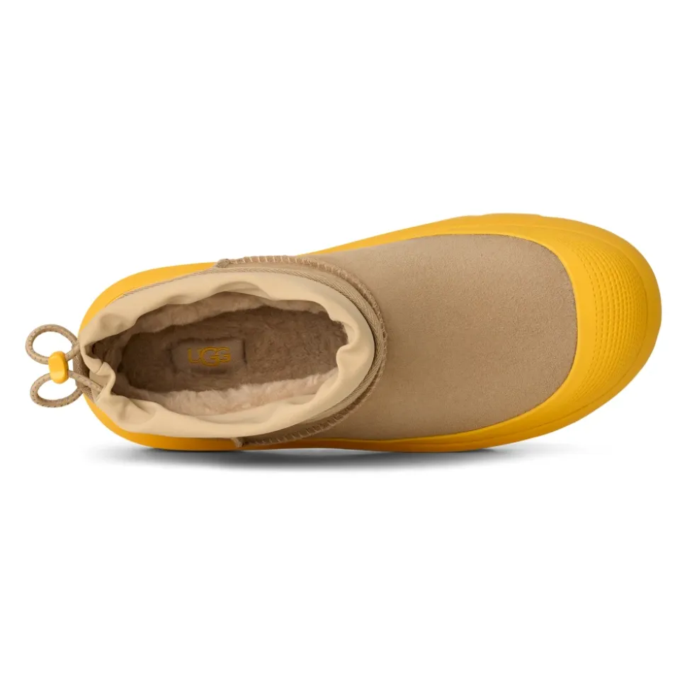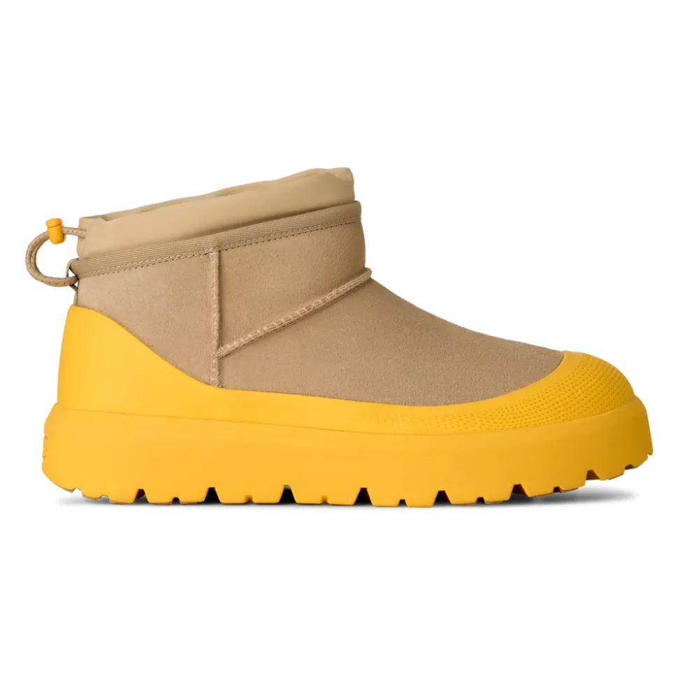UGG Classic Ultra Mini Weather Hybrid er en kortskaftet vinterstøvle, der kombinerer vandtæt ruskind med en justerbar lukning for ekstra beskyttelse i våde og kolde forhold. Den er designet til nem på- og aftagning samt forbedret trækkraft på glatte overflader. Vigtigste egenskaber: Multicolor | Mustard seed | Summer wheat | Ruskind | Vandtæt ruskind | Sømforseglet konstruktion | Spider Rubber-trækknopper | Sugarcane EVA-ydersål | Vinterklassificeret til -20°C | Justerbar lukning med elastisk snøre for justerbar pasform | UGGplush-foring og -indersål for komfort | Permanent skumgaloch | Ultra mini kort skaft | Justerbar lukning med elastisk snøre | UGG-logo på hæl | Sammensætning og pleje: Overdel: Vandtæt ruskind | Snørebånd: 45% polyester, 55% latex | Foring: 17 mm UGGplush (60% uld, 40% TENCEL Lyocell; bagside: polyester) | Indersål: 17 mm UGGplush (60% uld, 40% TENCEL Lyocell) | Ydersål: Sugarcane EVA med Spider Rubber-knopper | Fodseng: Støbt PU-fodseng