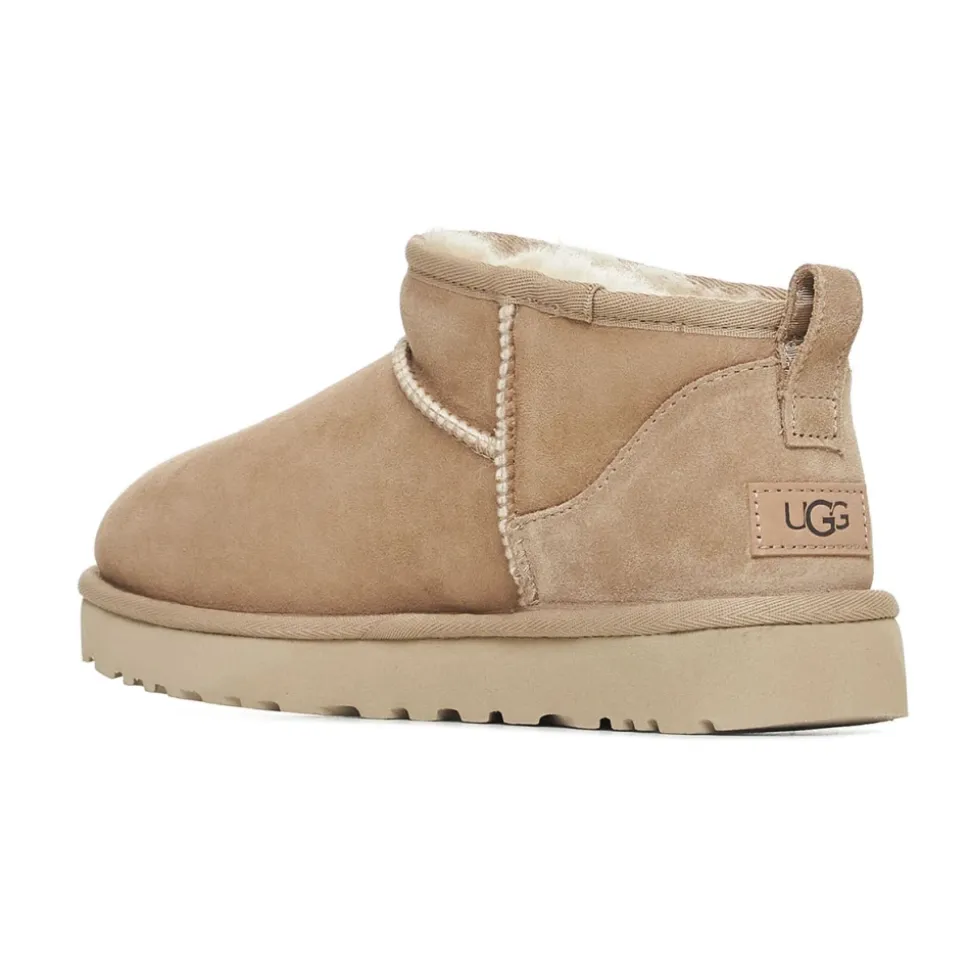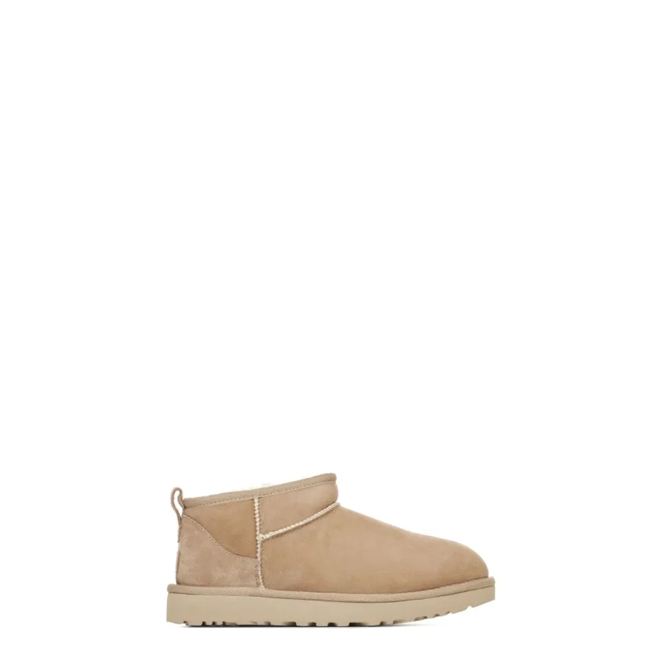 UGG Classic Ultra Mini bringer brandets karakteristiske varme fra fåreskind til en lav ankelstøvle, der er designet til nem på- og aftagning. Dens bløde shearling-foring og lette sål gør den ideel til hverdags komfort i koldt vejr. Vigtige egenskaber: Beige | Sand | Ruskind | Vandafvisende behandling | Let, fleksibel ydersål | Isolerende shearling-foring | Shearling-foring | Slip-on / pull-on design | Trækfane bagpå for nem på/af | Asymmetrisk toplinje | Overlock-stikningsdetaljer | Ruskindshælkappe | Rund tå | Trækfane bagpå | Dimensioner og pasform: Skaftehøjde: 8,9 cm | Normal i størrelsen | Sammensætning og pleje: Overdel: Twinface fåreskind (ruskind) | Foring: Fåreskind (shearling) | Indersål: UGGplush (uld og lyocell) | Ydersål: Treadlite by UGG / EVA / gummi | Pletrens; undgå maskinvask. Brug en ruskindbørste og mildt rengøringsmiddel til pletter.