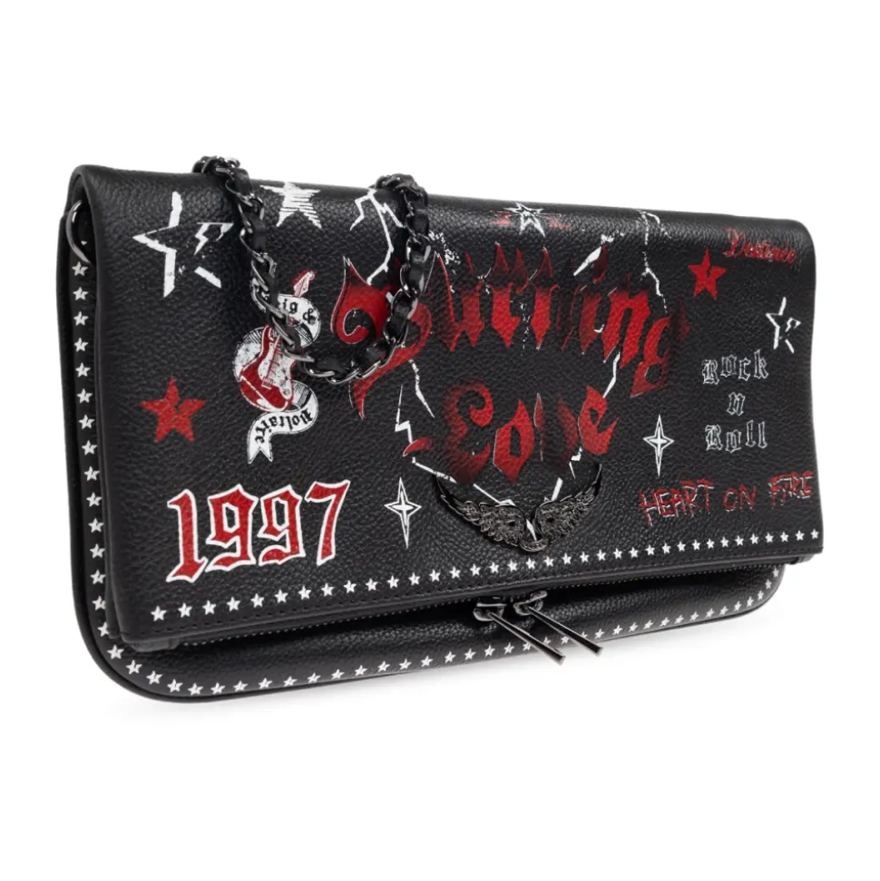 ROCK CLUTCH BAG af ZADIG & VOLTAIRE er et unikt tilbud til kendere af utraditionel stil. Dets rektangulære, forlængede silhuet, prydet med en formet magnetisk klap, glæder med subtil elegance kombineret med en tydelig karakter. Lavet af topkvalitets sort læder med en let kornet tekstur, intrigerer denne håndtaske med sine dristige tryk og broderier. Den centralt placerede “BURNING LOVE” indskrift, stjernemotiver, “1997” graffiti, “HEART ON FIRE” detaljer og et dekorativt metalsymbol tiltrækker opmærksomhed og refererer til rock- og tatoveringsinspirerede designs. Denne clutch fusionerer perfekt pariserens nonchalance med britisk fantasi og fungerer som udtryk for autenticitet og individualitet. HVORFOR SKAL DU VÆLGE DETTE PRODUKT? * Eksklusivt håndværk i læder med en tydelig tekstur * Avantgarde, iøjnefaldende udsmykninger * Dristig symbolik og et unikt vingemotiv * Signatur fra det velrenommerede Zadig & Voltaire brand * Perfekt valg til aftenarrangementer eller særlige lejligheder Højde: 14,5 cm Bredde på det bredeste punkt: 27 cm Modelmålinger: Højde: 176 cm Buste: 85 cm Talje: 60 cm Hofter: 89 cm