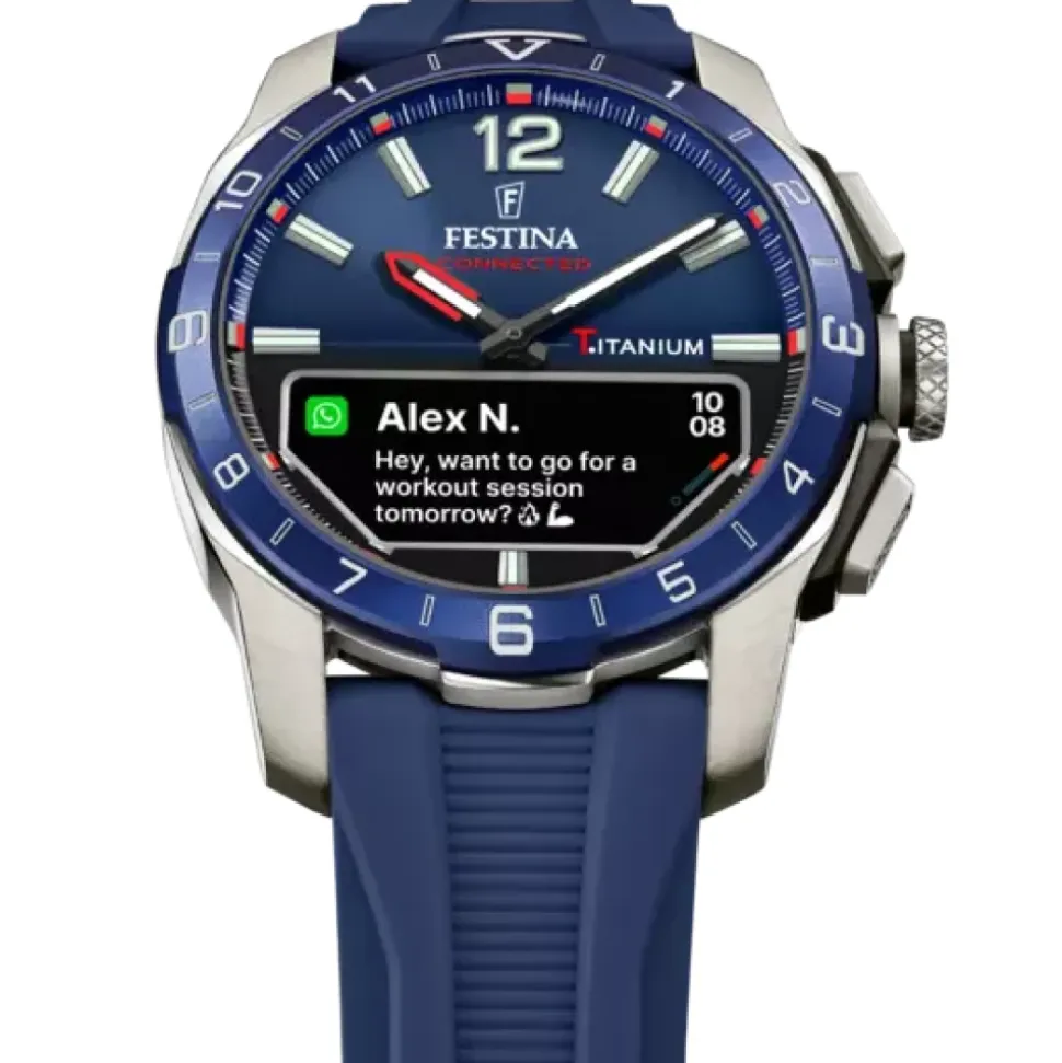 Festina Connected D Hybrid Smartwatch kombinerer klassisk analog stil med diskrete smarte funktioner, hvilket gør det velegnet til hverdagsbrug og aktivitetstracking. Nøgleattributter: Blå | Sølv | Titanium | Vandtæthed 3 ATM | Safirglas | Genopladeligt batteri (PD2430) | Hybrid urværk (FKS934) | Smarte funktioner: notifikationer, aktivitetssporing, pulsmåler | Ingen kalenderfunktion | Rund urkasse | Integreret analog-digital display | To-viser urskive | Tre trykknapper | Dimensioner og pasform: Urkassediameter 44 mm | Urkassetykkelse 13,96 mm | Rembredde 22,8 mm | Sammensætning og pleje: Titanium | Gummi | Safirglas | Tør af med en blød klud; undgå længerevarende nedsænkning i vand; følg producentens anvisninger for batteriopladning og service.