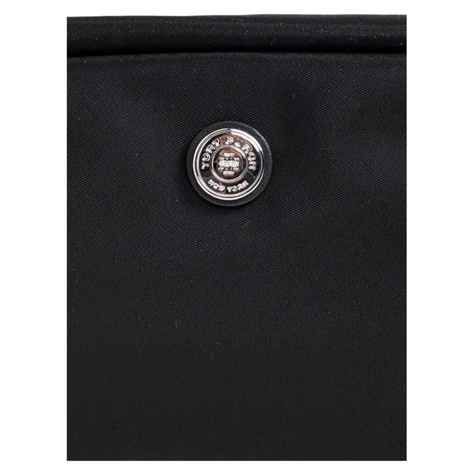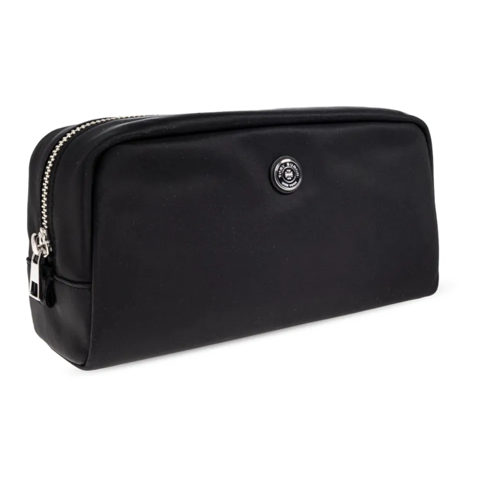 Tory Burch Cosmetic Bag with Logo er en kompakt, minimalistisk taske designet til at organisere dine daglige skønhedsprodukter. Den skiller sig ud med sit runde metallogo og brede lynlåslukning, der giver nem adgang. Vigtige egenskaber: Sort | Tekstil | Holdbar | Let at rengøre | Bred lynlåslukning | Solid bund | Rektangulær minimalistisk form | Blidt afrundede kanter | Rundt designerlogo i metal på fronten | Mål og pasform: Højde: 10 cm | Bredde på bredeste punkt: 19 cm | Bundbredde: 8 cm