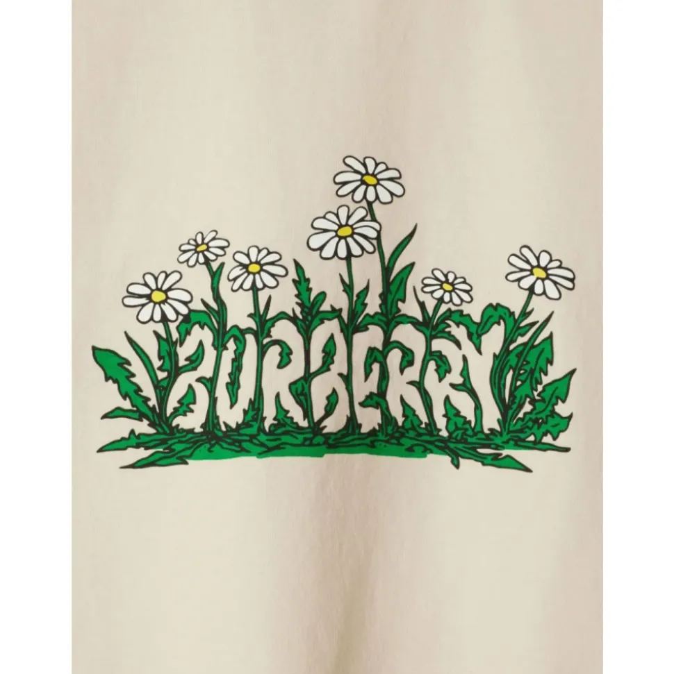 Opgrader din afslappede garderobe med Burberry Daisy Logo Print Bomulds T-shirten. Denne stilfulde beklædningsgenstand har et karakteristisk logoprint omgivet af margueritter, der tilbyder en unik blanding af klassisk og moderne design. Produkt detaljer: Beige | 100% Bomuld | Ribstrikket krave | Logo print med margueritter | Dimensioner og pasform: Regular fit | Sammensætning og pleje: 100% Bomuld | Maskinvask kold, tørretumbles ved lav varme.