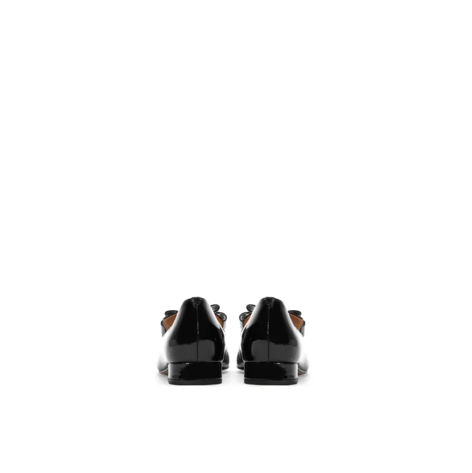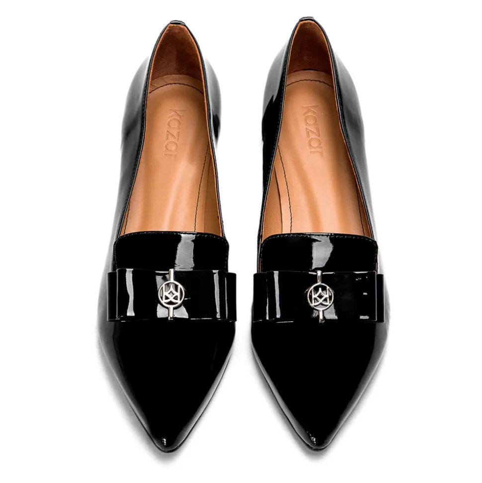 Damer sorte sko lavet af høj kvalitet laklæder, med et unikt design, der virkelig fanger øjet. Disse fantastiske sko er fremhævet af en højglans laklæder finish og en smuk bue fastgjort med KAZAR-logoet. Indersålen er lavet af ultrablødt fåreskind for at sikre behagelig brug. Den lave hæl løfter forsigtigt figuren, mens de spidse tæer optisk slanker foden.