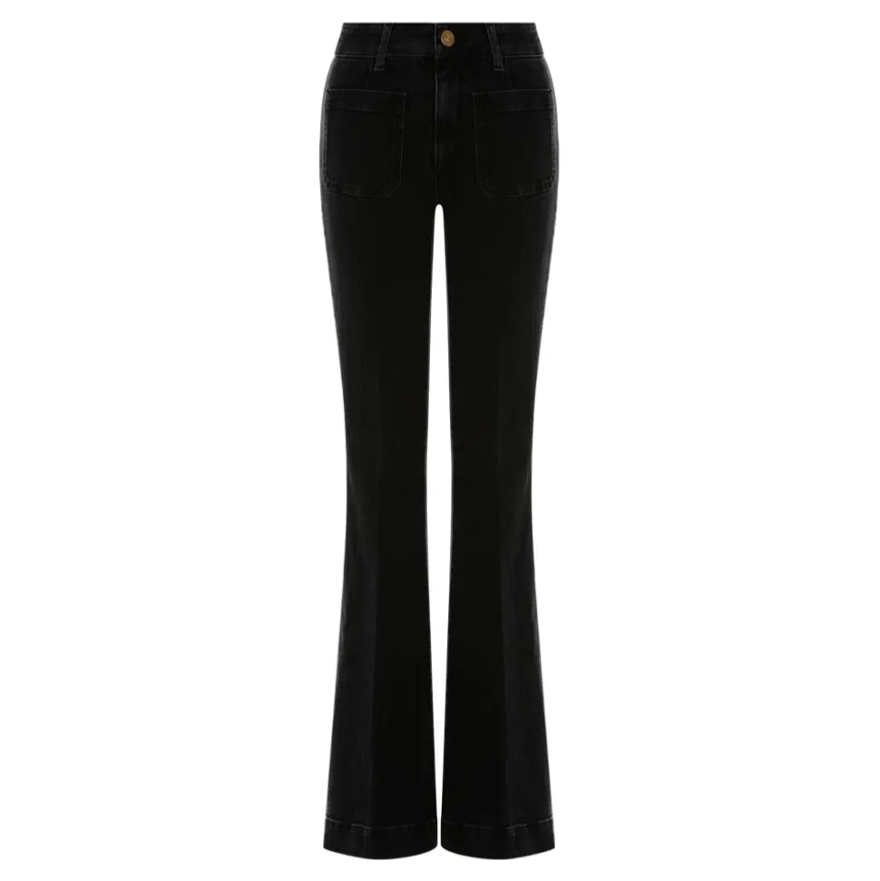 Seafarer Delphine Denim Stretch Jeans giver en 1970’er-inspireret flared silhuet et moderne twist med stræk, der gør dem behagelige at have på hver dag. Vigtige egenskaber: Sort | Denim | Strækstof | Lynlås og knaplukning foran | 4 påsatte lommer | Bæltestropper | Synlig knap- og lynlåslukning | Tætsiddende silhuet til knæene | Let flared kant | Creme logo broderi på bageste linning | 1970’er-inspireret klassisk mønster | Dimensioner & pasform: Høj talje | Tætsiddende over knæene | Let udvidet ved kanten | Sammensætning & pleje: 98% bomuld | 2% elastan