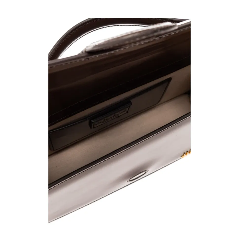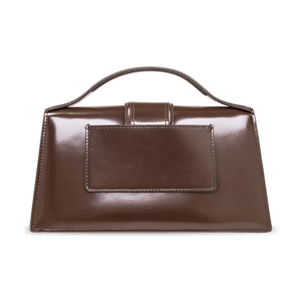 Præsenterer den brune Le Bambino Jacquemus lille skuldertaske, et must-have for modebevidste kvinder. Fremstillet af patentkalveskind, har denne cross body taske en magnetisk snaplukning med klap og en indvendig flad lomme til dine væsentlige ting. Det gyldne metallogo på forsiden tilføjer et strejf af elegance, mens lommen på bagsiden giver ekstra opbevaringsplads. Med en aftagelig og justerbar skulderrem samt en halvrund håndtag på toppen, tilbyder denne taske alsidighed og stil. Det beige interiør og dimensionerne på 23,5 x 13 cm fuldender det chikke design. Materialeoplysninger inkluderer kalveskind og et bomuldsfor.