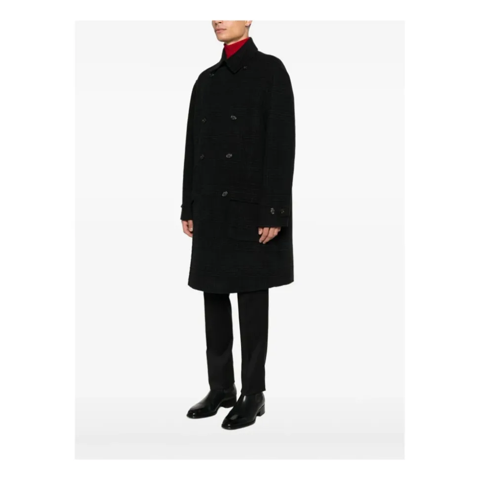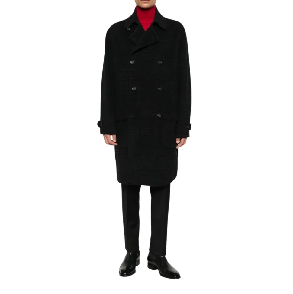 Paolo Pecoras dobbeltradede ternede frakke opdaterer klassisk skrædderi med en dobbeltradet silhuet og frontklaplommer, hvilket giver et afslappet, men struktureret lag til smarte, afslappede looks. Vigtige egenskaber: Sort | Uld | Knaplukning | Frontklaplommer | Spænder ved manchetter | Dobbeltradet | Spidse revers | Lange ærmer | Tartan | Ternet mønster | Lige søm | Dimensioner og pasform: Afslappet pasform | Materiale og pleje: 100% uld | Håndvask ved 30°C eller rens. Må ikke bleges. Må ikke tørretumbles. Stryg ved medium temperatur.