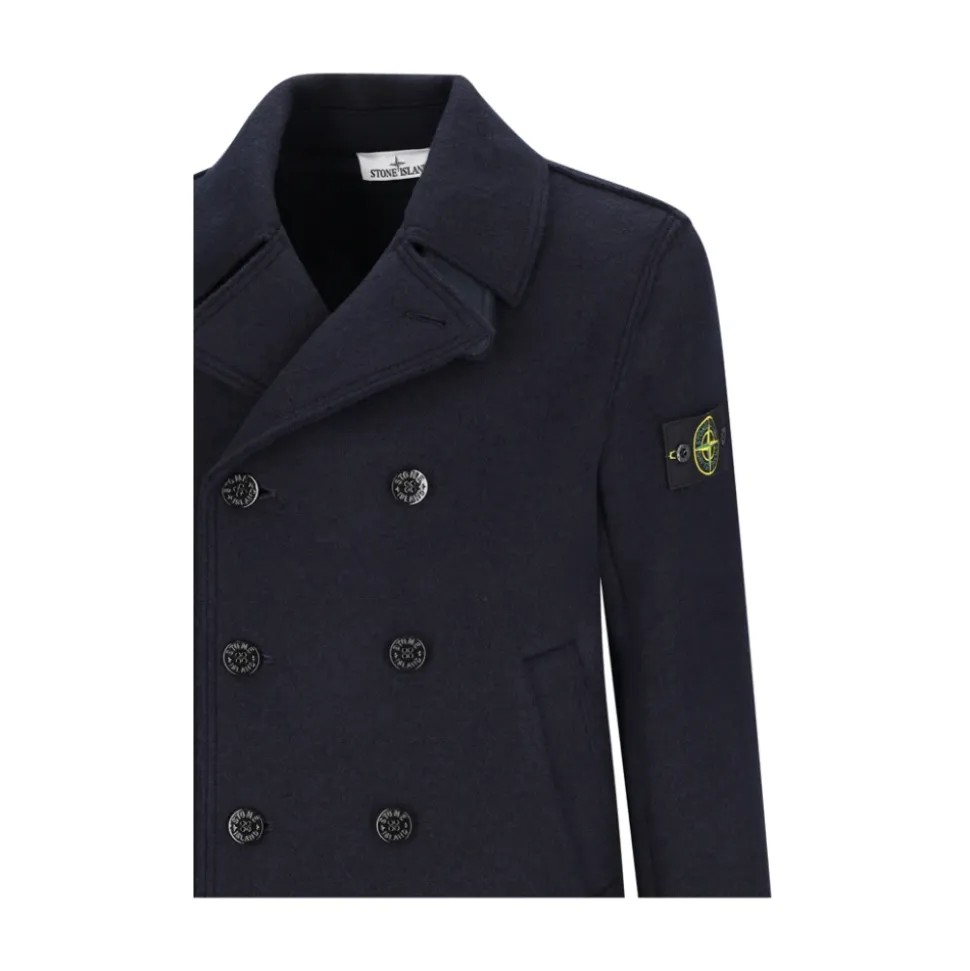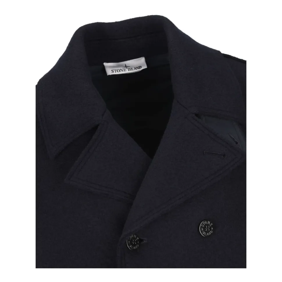 Stone Island Double-breasted Pea Coat fortolker den klassiske sømandskravefrakke med en oversized silhuet og RWS-filtuldskonstruktion for tekstureret varme og struktureret lagdeling. Nøgleattributter: Blå | Marineblå | RWS-filtuld | Knaplukning foran | Hagestrop med knaplukning | Udvendige håndlommer | Double-breasted design | Høj hals | Hakket revers | Underkrave i nylon twill | Signaturlogomærke på ærmet | Dimensioner og pasform: Oversized pasform | Sammensætning og pleje: Beklædning: 100% ny uld | Detaljer: 100% polyamid | Detaljer: 100% polyurethanharpiks