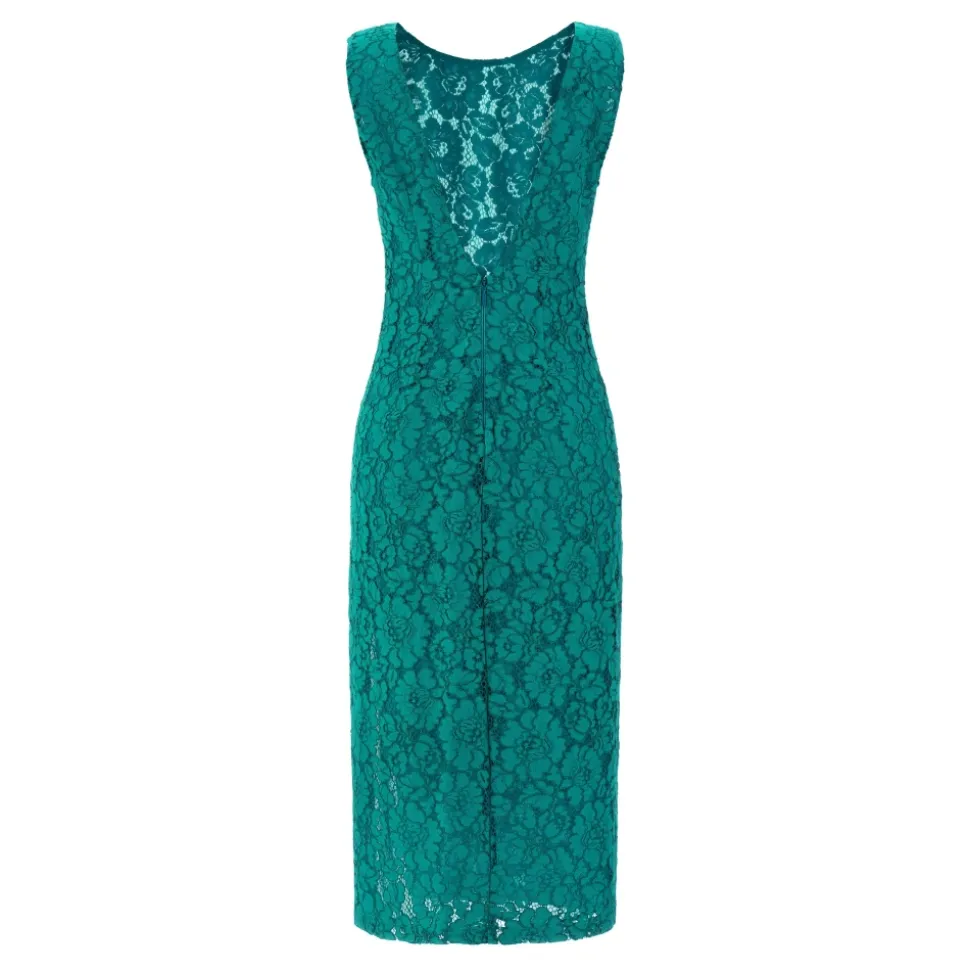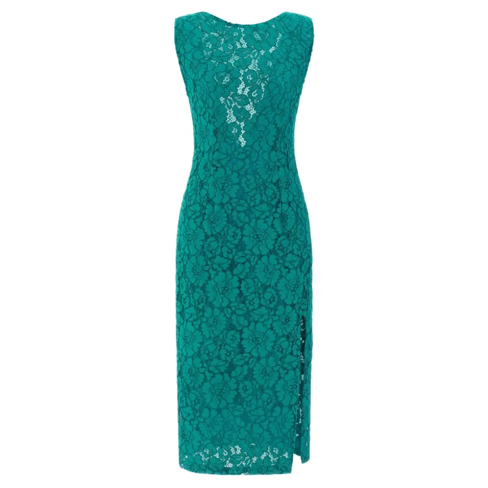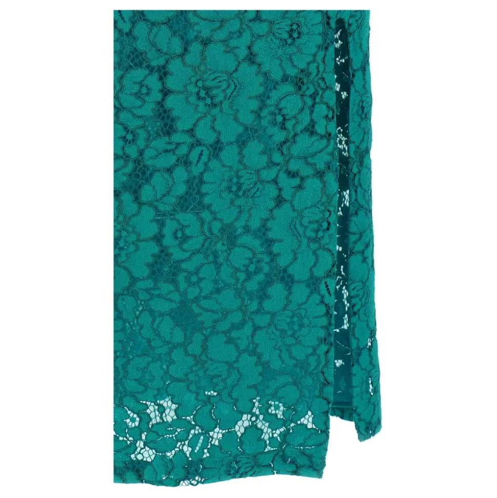 PINKO Drupa Blondekjole i Midi-længde er en blondeskedekjole designet til fest- og aftenbrug, med en tone-i-tone semi-transparent overdel for raffineret lagdeling og visuel dybde. Vigtige egenskaber: Grøn | Blonde | Lukning bagpå med skjult lynlås | Dobbelt semi-transparent lag | Ærmeløs skedekjole | Bådhalsudskæring | Dyb rygudskæring | Sideslids | Drupa blondeoverdel | Tone-i-tone semi-transparent lag | Dimensioner og pasform: Normal i størrelsen
