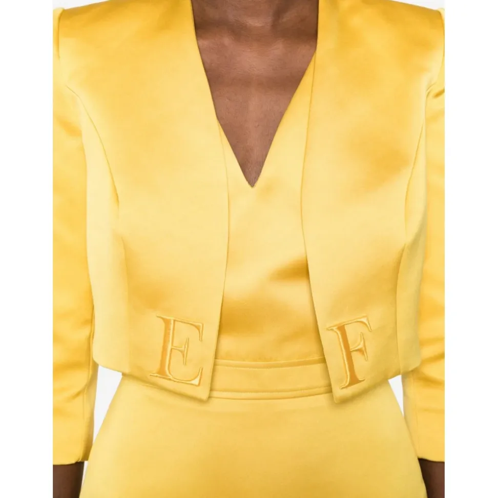 Elisabetta Franchi Duchess Satin Kjole med Tylryg og Jakke kombinerer struktureret skrædderarbejde med gennemsigtige detaljer bagpå, ideel til formelle dagsarrangementer og receptioner. Vigtigste egenskaber: Gul | Polyester | Vatterede skuldre på jakken | Indvendig foring | Skjult lynlås bagpå | V-hals | Ærmeløs kjole | Tylryg med transparent detalje | Broderede logo detaljer på jakken | Struktureret jakke med formede snit | Mål og pasform: Længde 95 cm (IT størrelse 40) | Modelhøjde 177 cm, iført IT størrelse 40 | Almindelig pasform | Sammensætning og pleje: 100% Polyester