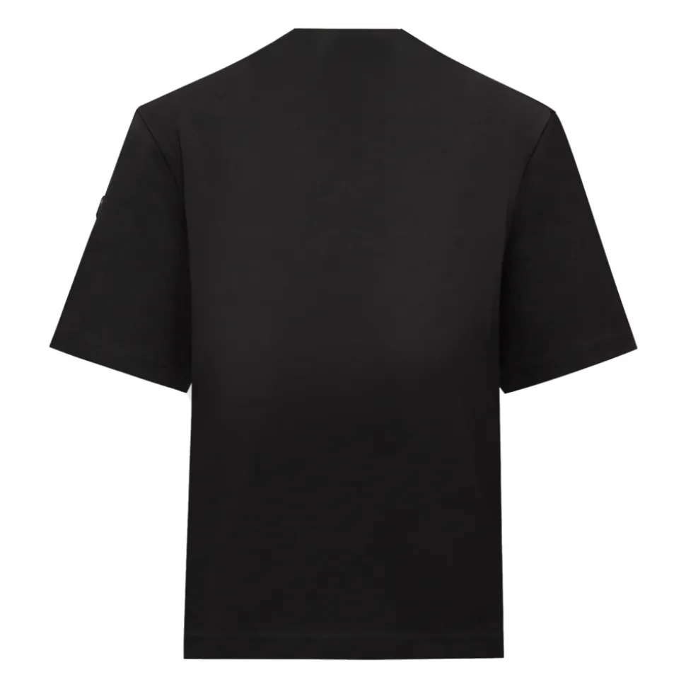 Moncler EE72 T-shirt kombinerer en struktureret viskose neoprenkonstruktion med en klassisk crew-neck silhuet for en raffineret hverdags-tee. Vigtige egenskaber: Sort | Viskose neopren | Rund hals | Korte ærmer | Logo patch | Slids bagpå | Dimensioner og pasform: Størrelse på foto: XS | Sammensætning og pleje: Viskose neopren