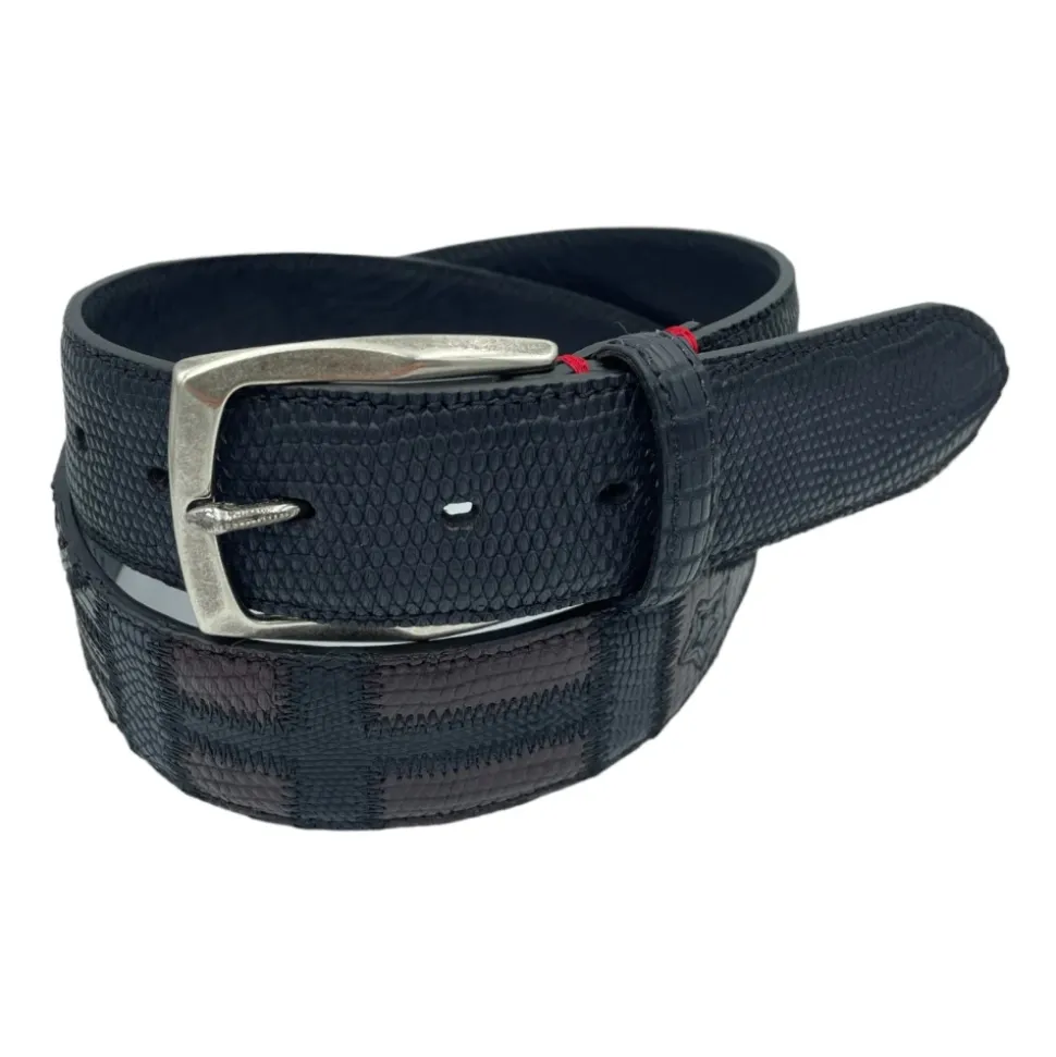 Paolo Vitale Eksklusivt Bælte er fremstillet af certificeret firbensskind med flagmotiver og et solidt messing spænde. Håndlavet i Italien for et raffineret, markant tilbehør. Vigtigste egenskaber: Sort | Sort | Firbensskind | Solidt messing spænde | Flagmotiver | Certificeret firbensskind | Håndlavet i Italien | Sammensætning & pleje: Firbensskind | Messing
